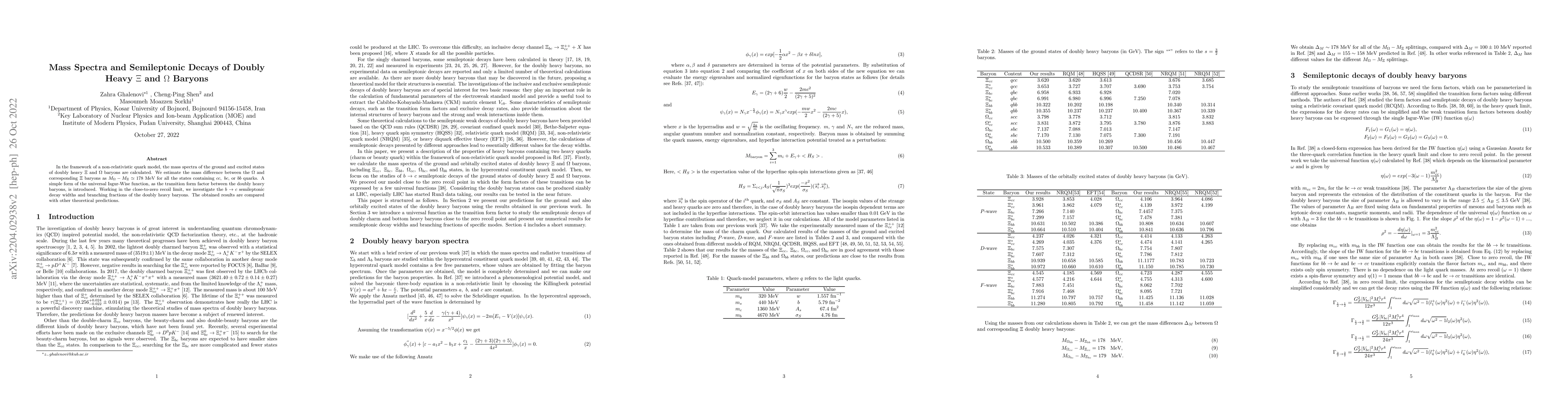 This paper calculates the mass spectra of doubly heavy $\Xi$ and $\Omega$ baryons using a non-relativistic quark model, finding a consistent mass difference of approximately 178 MeV. It also investigates semileptonic decay widths and branching fractions for these baryons, comparing results with other theoretical predictions.