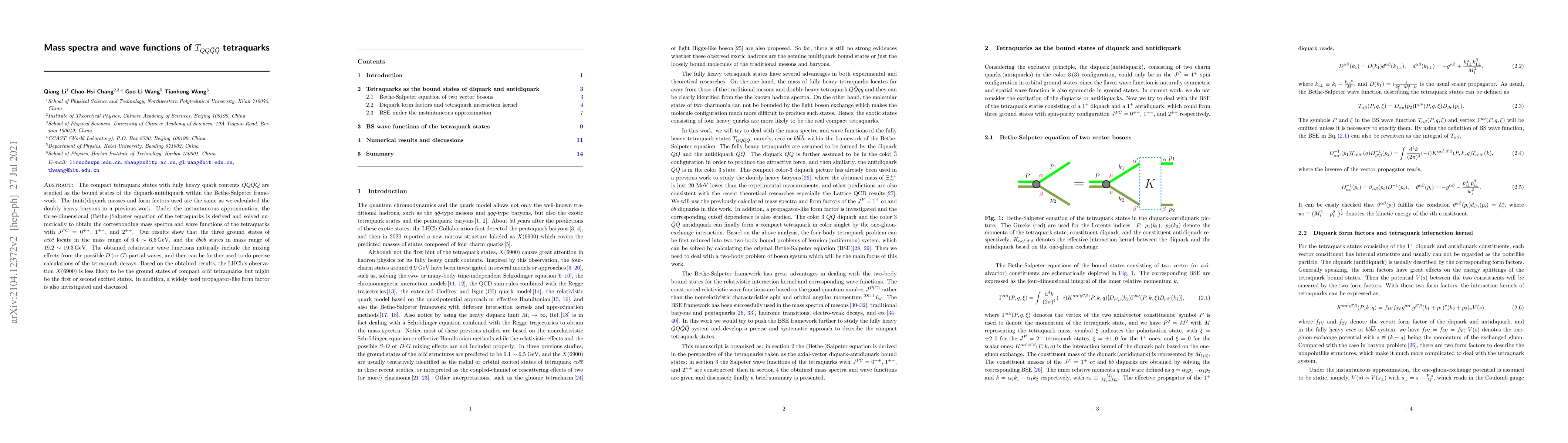 Researchers studied compact tetraquark states with fully heavy quark contents $QQar Qar Q$ using the Bethe-Salpeter framework, finding mass spectra and wave functions for ground states in a range of 6.4-6.5 GeV and 19.2-19.3 GeV.