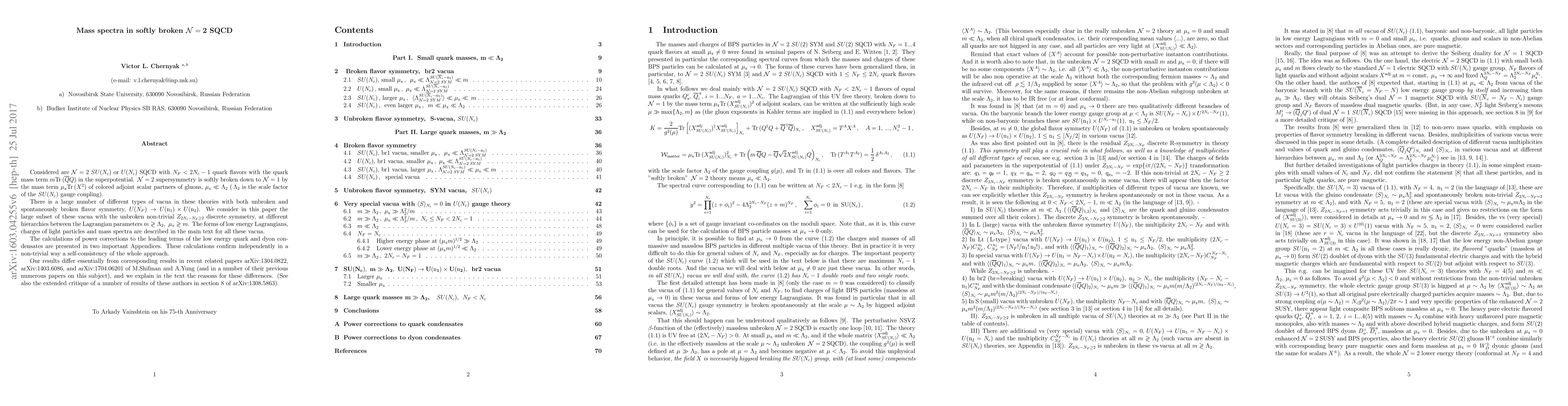 Considered are ${\cal N}=2\, SU(N_c)$ or $U(N_c)$ SQCD with $N_F<2N_c-1$ quark flavors with the quark mass term $m{\rm Tr}\,({\bar Q} Q)$ in the superpotential. ${\cal N}=2$ supersymmetry is softly broken down to ${\cal N}=1$ by the mass term $\mu_{\rm x}{\rm Tr}\,(X^2)$ of colored adjoint scalar partners of gluons, $\mu_{\rm x}\ll\Lambda_2$ ($\Lambda_2$ is the scale factor of the $SU(N_c)$ gauge coupling). There is a large number of different types of vacua in these theories with both unbroken and spontaneously broken flavor symmetry, $U(N_F)\rightarrow U({\rm n}_1)\times U({\rm n}_2)$. We consider in this paper the large subset of these vacua with the unbroken nontrivial $Z_{2N_c-N_F\geq 2}$ discrete symmetry, at different hierarchies between the Lagrangian parameters $m\gtrless\Lambda_2,\,\, \mu_{\rm x}\gtrless m$. The forms of low energy Lagrangians, quantum numbers of light particles and mass spectra are described in the main text for all these vacua. The calculations of power corrections to the leading terms of the low energy quark and dyon condensates are presented in two important Appendices. These calculations confirm additionally in a non-trivial way a self-consistency of the whole approach. Our results differ essentially from corresponding results in recent related papers arXiv:1304.0822, arXiv:1403.6086, and arXiv:1704.06201 of M.Shifman and A.Yung (and in a number of their numerous previous papers on this subject), and we explain in the text the reasons for these differences (see also the extended critique of a number of results of these authors in section 8 of arXiv:1308.5863).