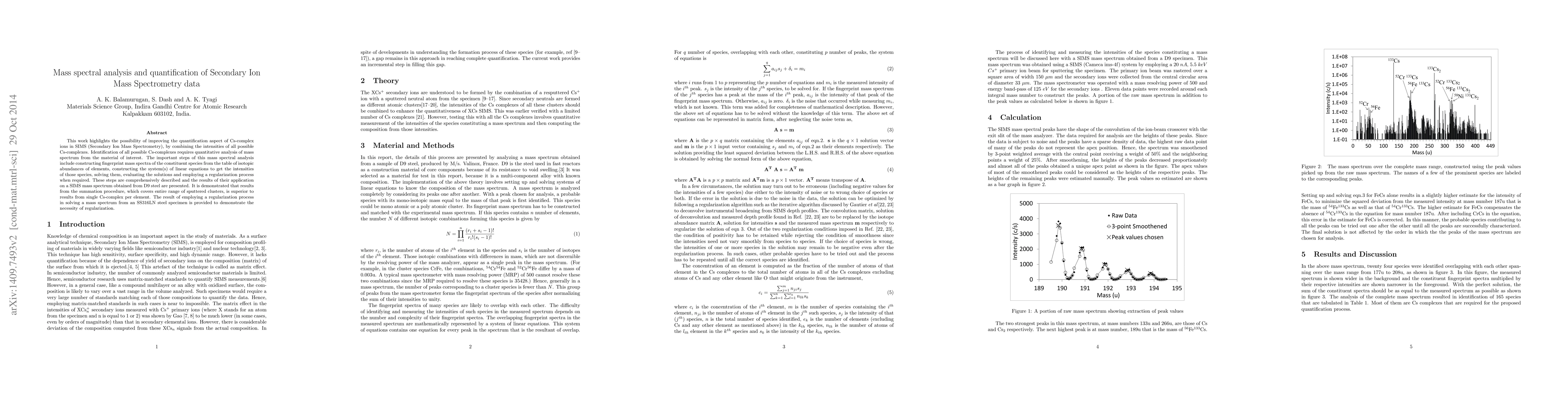 The paper presents a detailed method for mass spectral analysis and quantification of Cs-complex ions in SIMS, including the construction of fingerprint mass spectra, solving systems of linear equations, and applying regularization.