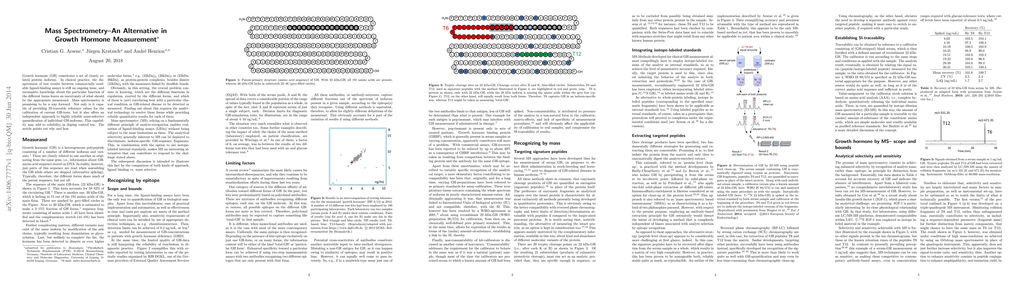 This paper discusses the potential of mass spectrometry as an alternative for growth hormone measurement, addressing discrepancies in current ligand-binding assays and offering a reliable, SI-traceable method for quantifying individual GH isoforms, which could enhance both clinical diagnostics and doping control.