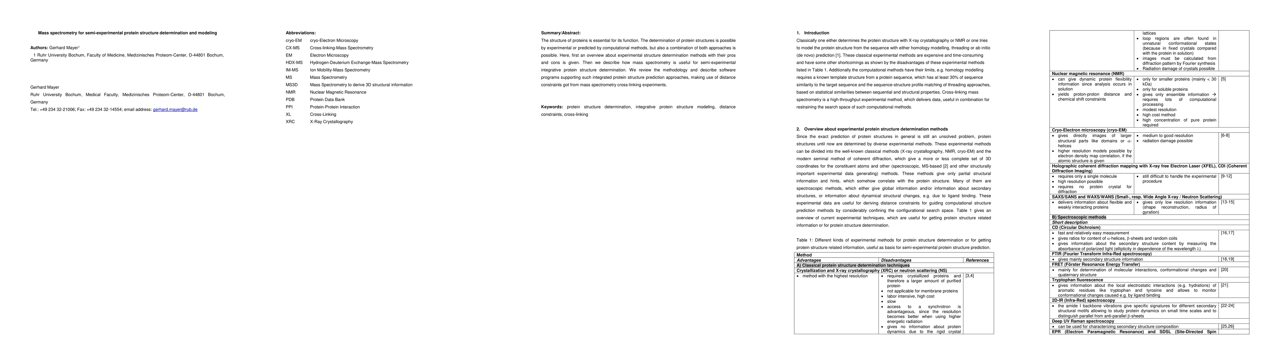 The structure of proteins is essential for its function. The determination of protein structures is possible by experimental or predicted by computational methods, but also a combination of both approaches is possible. Here, first an overview about experimental structure determination methods with their pros and cons is given. Then we describe how mass spectrometry is useful for semi-experimental integrative protein structure determination. We review the methodology and describe software programs supporting such integrated protein structure prediction approaches, making use of distance constraints got from mass spectrometry cross-linking experiments
