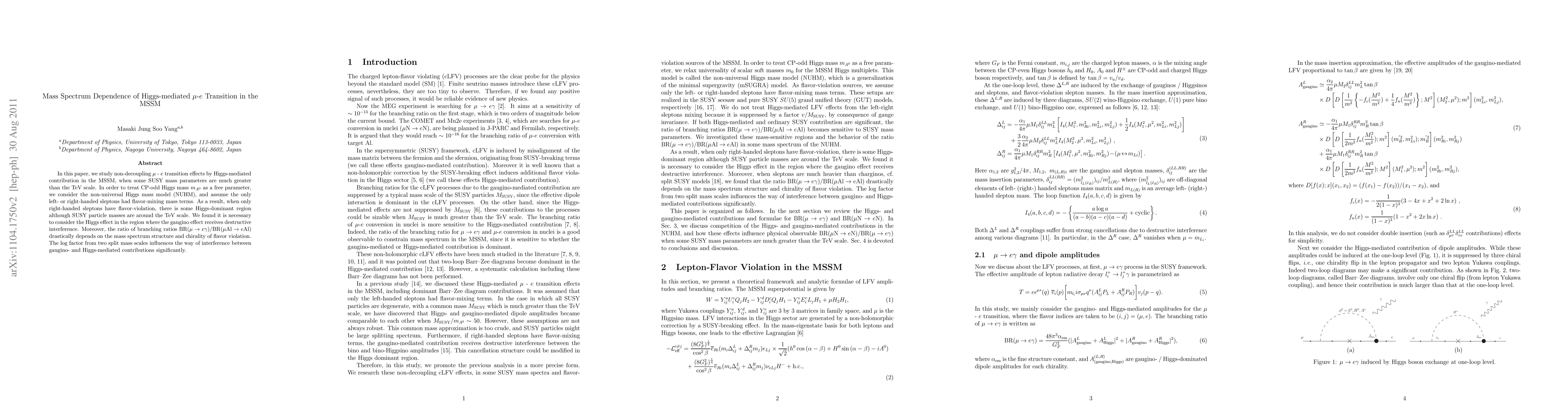 This paper investigates the Higgs-mediated $\mu$-$e$ transition in the MSSM under non-decoupling conditions, focusing on the impact of high SUSY mass parameters. It finds that the ratio of branching ratios $\BR(\meg) / \BR(\maleal)$ is significantly influenced by the mass spectrum structure and chirality of flavor violation, especially when both Higgs-mediated and ordinary SUSY contributions are significant.