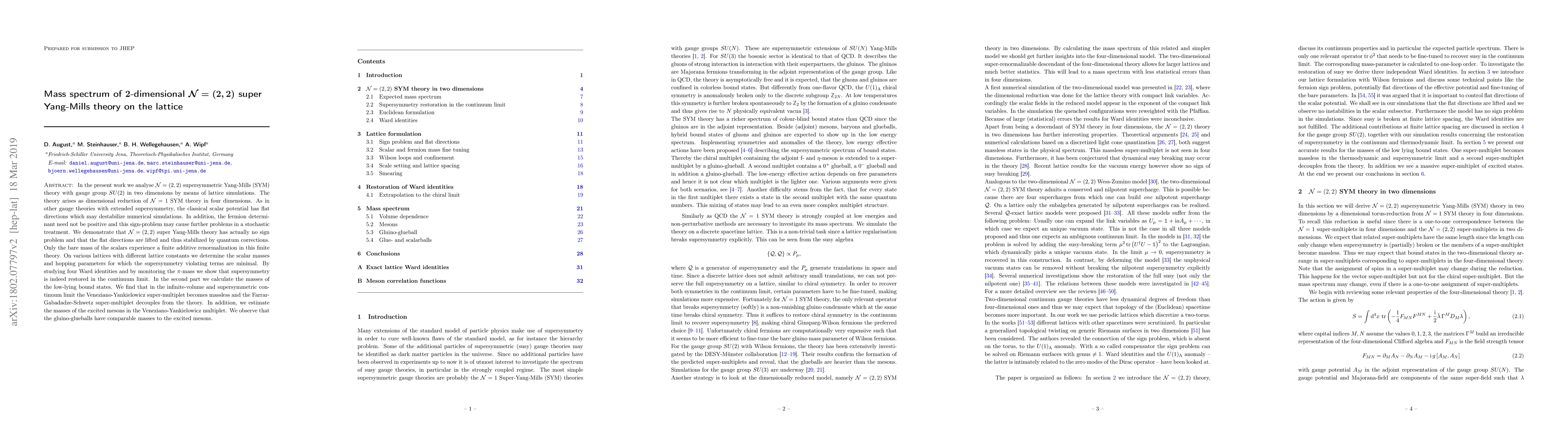 This research investigates $\mathcal{N}=(2,2)$ supersymmetric Yang-Mills theory on a lattice, confirming that it has no sign problem and quantum corrections lift its classical flat directions. It demonstrates restored supersymmetry in the continuum limit and calculates the masses of low-lying bound states, finding that the Veneziano-Yankielowicz super-multiplet becomes massless while the Farrar-Gabadadze-Schwetz super-multiplet decouples.
