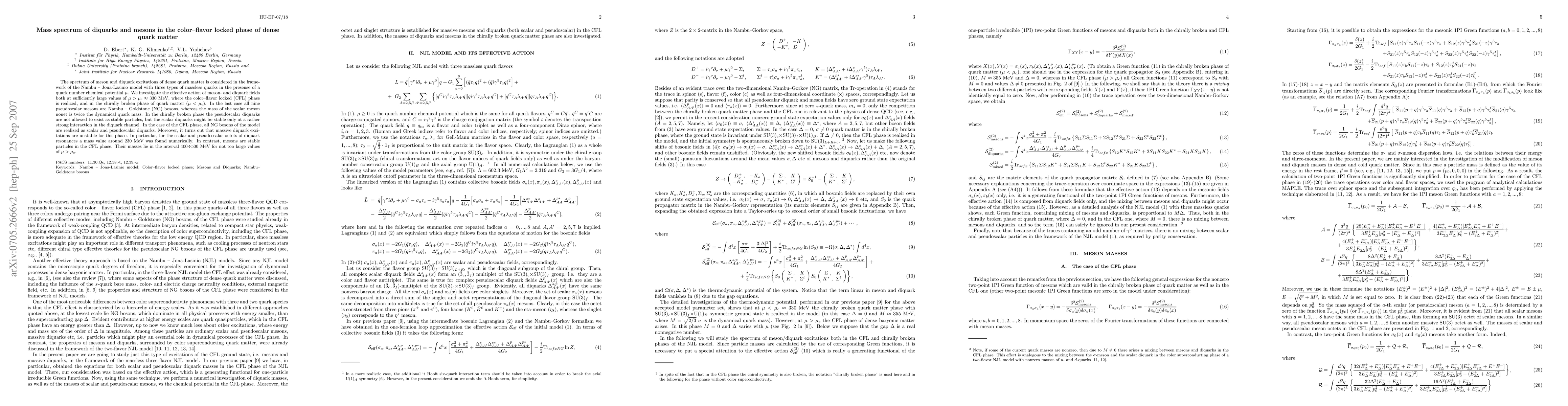 The spectrum of meson and diquark excitations of dense quark matter is considered in the framework of the Nambu -- Jona-Lasinio model with three types of massless quarks in the presense of a quark number chemical potential $\mu$. We investigate the effective action of meson- and diquark fields both at sufficiently large values of $\mu>\mu_c\approx 330$ MeV, where the color--flavor locked (CFL) phase is realized, and in the chirally broken phase of quark matter ($\mu<\mu_c$). In the last case all nine pseudoscalar mesons are Nambu -- Goldstone (NG) bosons, whereas the mass of the scalar meson nonet is twice the dynamical quark mass. In the chirally broken phase the pseudoscalar diquarks are not allowed to exist as stable particles, but the scalar diquarks might be stable only at a rather strong interaction in the diquark channel. In the case of the CFL phase, all NG bosons of the model are realized as scalar and pseudoscalar diquarks. Moreover, it turns out that massive diquark excitations are unstable for this phase. In particular, for the scalar and pseudoscalar octets of diquark resonances a mass value around 230 MeV was found numerically. In contrast, mesons are stable particles in the CFL phase. Their masses lie in the interval 400$\div$500 MeV for not too large values of $\mu>\mu_c$.