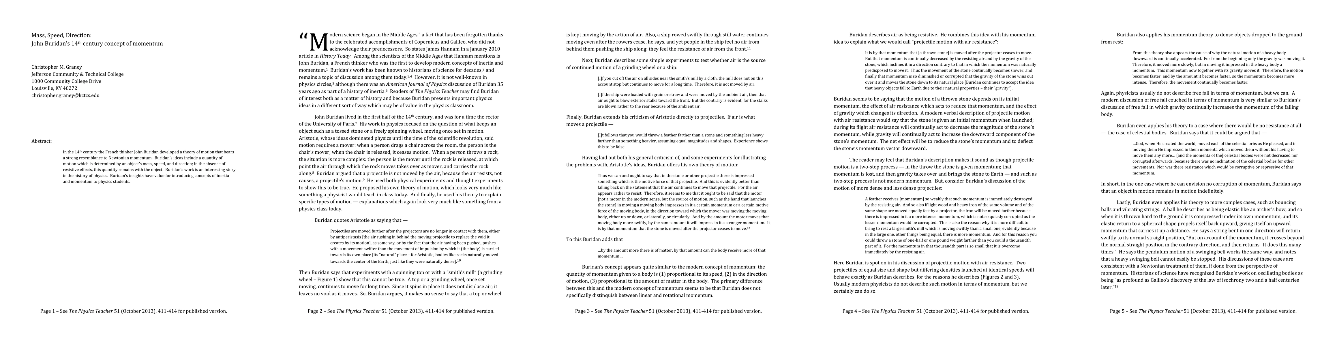 In the 14th century the French thinker John Buridan developed a theory of motion that bears a strong resemblance to Newtonian momentum. Buridan's ideas include a quantity of motion which is determined by an object's mass, speed, and direction; in the absence of resistive effects, this quantity remains with the object. Buridan's work is an interesting story in the history of physics. Buridan's insights have value for introducing concepts of inertia and momentum to physics students.