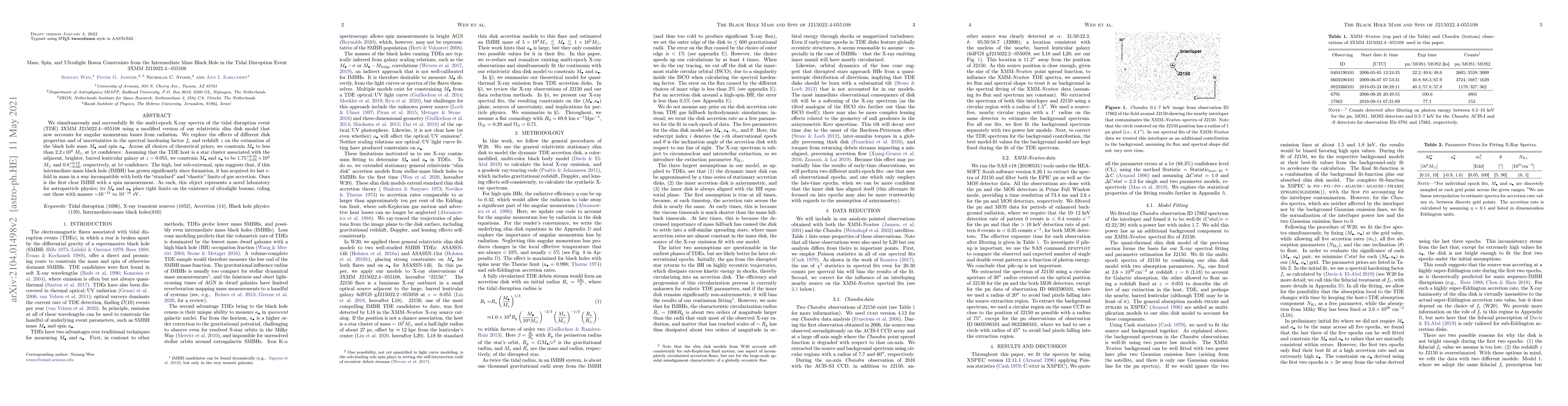 We simultaneously and successfully fit the multi-epoch X-ray spectra of the tidal disruption event (TDE) 3XMM J215022.4-055108 using a modified version of our relativistic slim disk model that now accounts for angular momentum losses from radiation. We explore the effects of different disk properties and of uncertainties in the spectral hardening factor fc and redshift z on the estimation of the black hole mass M and spin a. Across all choices of theoretical priors, we constrain M to less than 2.2e4 Ms at 1 sigma confidence. Assuming that the TDE host is a star cluster associated with the adjacent, brighter, barred lenticular galaxy at z=0.055, we constrain M and a to be (1.75+0.45-0.05)e4 Ms and 0.8+0.12-0.02, respectively, at 1 sigma confidence. The high, but sub-extremal, spin suggests that, if this intermediate mass black hole (IMBH) has grown significantly since formation, it has acquired its last e-fold in mass in a way incompatible with both the standard and chaotic limits of gas accretion. Ours is the first clear IMBH with a spin measurement. As such, this object represents a novel laboratory for astro-particle physics; its M and a place tight limits on the existence of ultralight bosons, ruling out those with masses 1.0e-15 to 1.0e-16 eV.