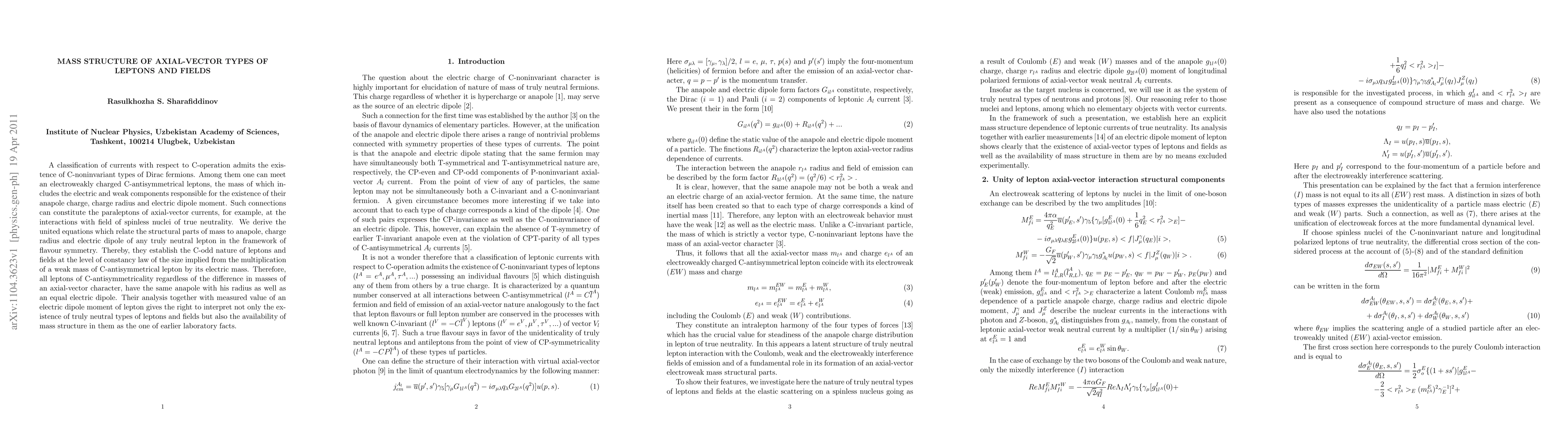 A classification of currents with respect to C-operation admits the existence of C-noninvariant types of Dirac fermions. Among them one can meet an electroweakly charged C-antisymmetrical leptons, the mass of which includes the electric and weak components responsible for the existence of their anapole charge, charge radius and electric dipole moment. Such connections can constitute the paraleptons of axial-vector currents, for example, at the interactions with field of spinless nuclei of true neutrality. We derive the united equations which relate the structural parts of mass to anapole, charge radius and electric dipole of any truly neutral lepton in the framework of flavour symmetry. Thereby, they establish the C-odd nature of leptons and fields at the level of constancy law of the size implied from the multiplication of a weak mass of C-antisymmetrical lepton by its electric mass. Therefore, all leptons of C-antisymmetricality regardless of the difference in masses of an axial-vector character, have the same anapole with his radius as well as an equal electric dipole. Their analysis together with measured value of an electric dipole moment of lepton gives the right to interpret not only the existence of truly neutral types of leptons and fields but also the availability of mass structure in them as the one of earlier laboratory facts.