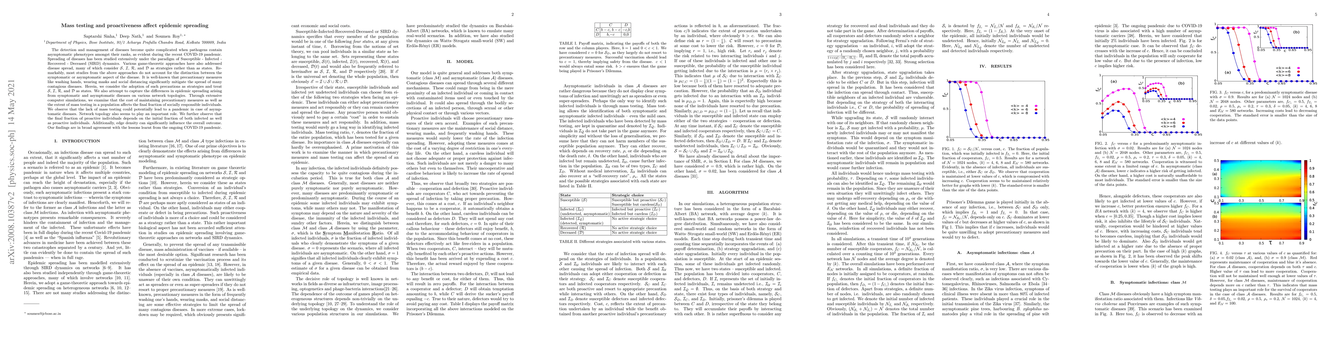 The detection and management of diseases become quite complicated when pathogens contain asymptomatic phenotypes amongst their ranks, as evident during the recent COVID-19 pandemic. Spreading of diseases has been studied extensively under the paradigm of Susceptible - Infected - Recovered - Deceased (SIRD) dynamics. Various game-theoretic approaches have also addressed disease spread, many of which consider S, I, R, and D as strategies rather than as states. Remarkably, most studies from the above approaches do not account for the distinction between the symptomatic or asymptomatic aspect of the disease. It is well-known that precautionary measures like washing hands, wearing masks and social distancing significantly mitigate the spread of many contagious diseases. Herein, we consider the adoption of such precautions as strategies and treat S, I, R, and D as states. We also attempt to capture the differences in epidemic spreading arising from symptomatic and asymptomatic diseases on various network topologies. Through extensive computer simulations, we examine that the cost of maintaining precautionary measures as well as the extent of mass testing in a population affects the final fraction of socially responsible individuals. We observe that the lack of mass testing could potentially lead to a pandemic in case of asymptomatic diseases. Network topology also seems to play an important role. We further observe that the final fraction of proactive individuals depends on the initial fraction of both infected as well as proactive individuals. Additionally, edge density can significantly influence the overall outcome. Our findings are in broad agreement with the lessons learnt from the ongoing COVID-19 pandemic.