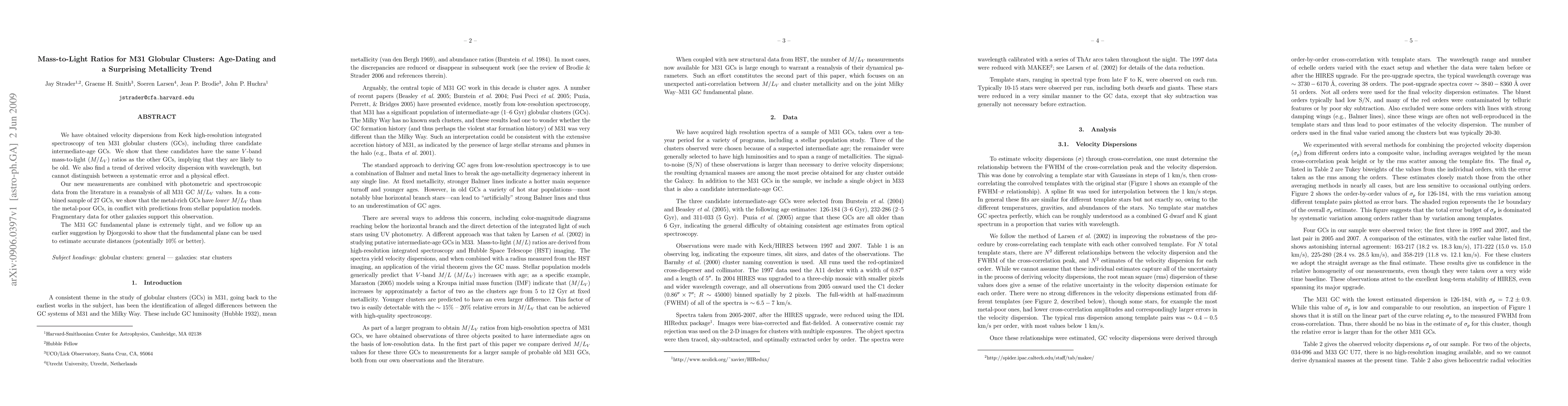 We have obtained velocity dispersions from Keck high-resolution integrated spectroscopy of ten M31 globular clusters (GCs), including three candidate intermediate-age GCs. We show that these candidates have the same V-band mass-to-light (M/L_V) ratios as the other GCs, implying that they are likely to be old. We also find a trend of derived velocity dispersion with wavelength, but cannot distinguish between a systematic error and a physical effect. Our new measurements are combined with photometric and spectroscopic data from the literature in a reanalysis of all M31 GC M/L_V values. In a combined sample of 27 GCs, we show that the metal-rich GCs have *lower* M/L_V than the metal-poor GCs, in conflict with predictions from stellar population models. Fragmentary data for other galaxies support this observation. The M31 GC fundamental plane is extremely tight, and we follow up an earlier suggestion by Djorgovski to show that the fundamental plane can be used to estimate accurate distances (potentially 10% or better).