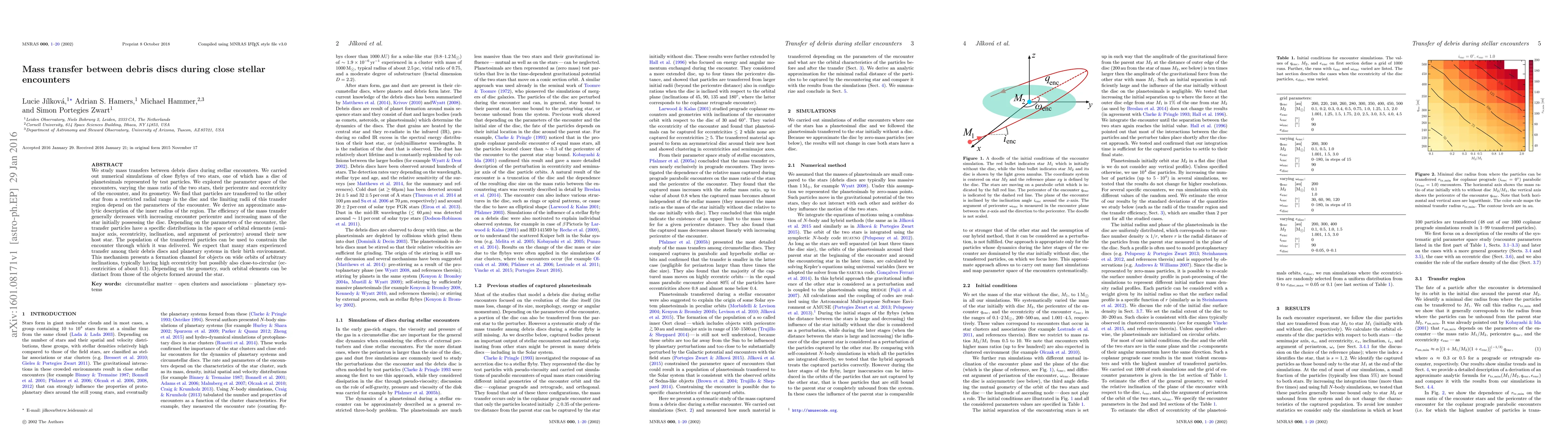 This paper investigates mass transfer between debris discs during stellar encounters using numerical simulations. It finds that mass transfer is efficient but depends on encounter parameters, with transferred particles forming distinct populations that can constrain the encounter's geometry and dynamics.