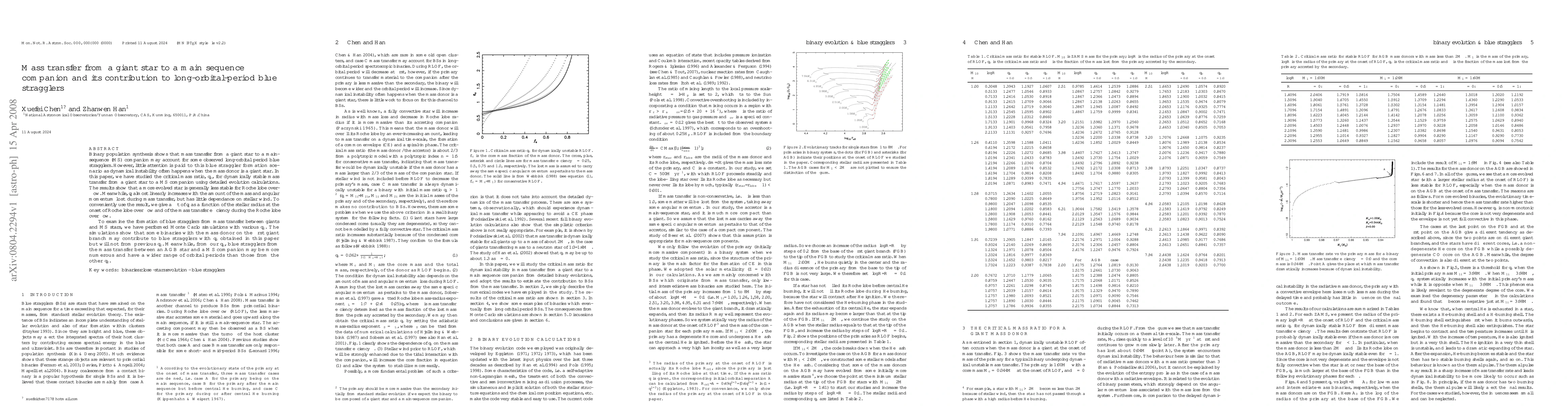 This paper explores the mass transfer from giant stars to main sequence companions and its role in forming long-orbital-period blue stragglers. It finds that dynamically stable mass transfer is possible under certain conditions, with the critical mass ratio $q_{\rm c}$ increasing with mass and angular momentum loss, but not significantly affected by stellar wind. Simulations show that mass transfer from first giant branch stars and more evolved asymptotic giant branch stars can create blue stragglers under the new $q_{\rm c}$ criteria.
