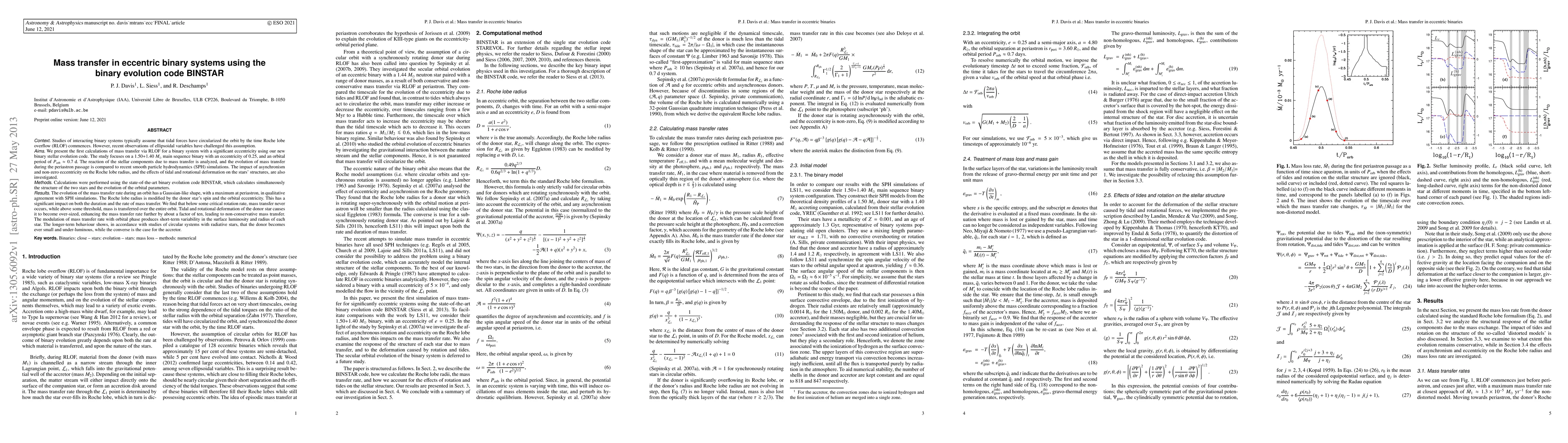 This paper investigates mass transfer in eccentric binary systems using the BINSTAR code, focusing on a 1.50+1.40 Msun binary with eccentricity 0.25. It finds that mass transfer peaks at periastron and is influenced by the donor star's spin and orbital eccentricity, leading to significant variability in luminosity and radius.