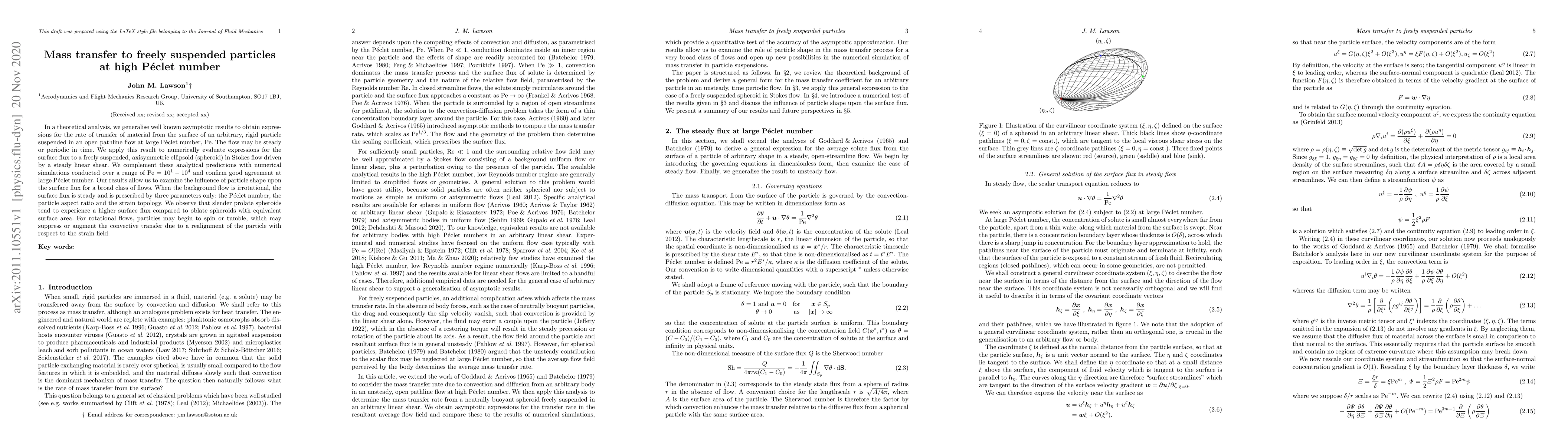 This paper generalizes asymptotic results to derive expressions for mass transfer rates to freely suspended particles at high P\'eclet numbers, applying them to axisymmetric ellipsoids in Stokes flow. Numerical simulations confirm the analytical predictions and show that slender prolate spheroids experience higher surface flux compared to oblate spheroids, with particle shape significantly influencing the transfer rate.