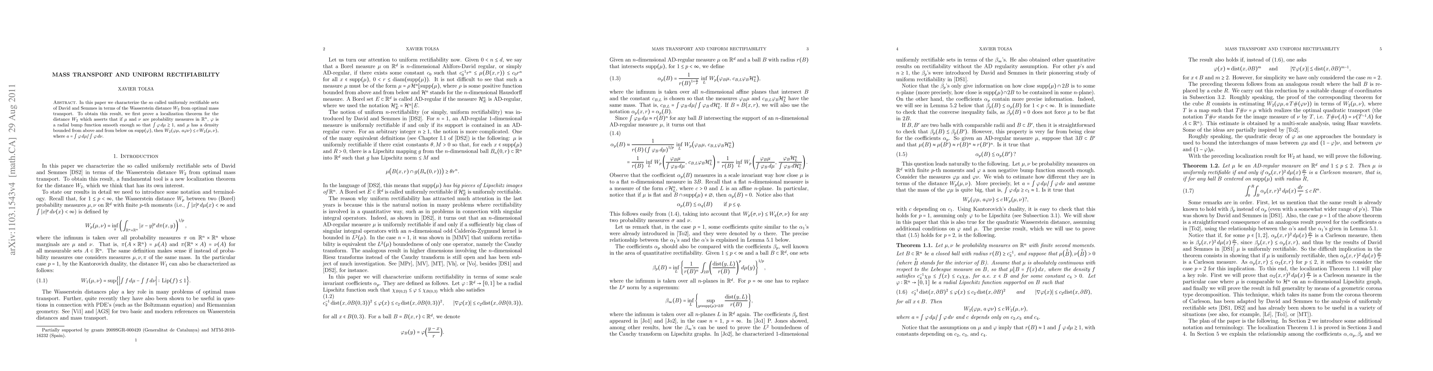 In this paper we characterize the so called uniformly rectifiable sets of David and Semmes in terms of the Wasserstein distance $W_2$ from optimal mass transport. To obtain this result, we first prove a localization theorem for the distance $W_2$ which asserts that if $\mu$ and $\nu$ are probability measures in $R^n$, $\phi$ is a radial bump function smooth enough so that $\int\phi d\mu\gtrsim1$, and $\mu$ has a density bounded from above and from below on the support of \phi, then $W_2(\phi\mu,a\phi\nu)\leq c W_2(\mu,\nu),$ where $a=\int\phi d\mu/ \int\phi\,d\nu$.