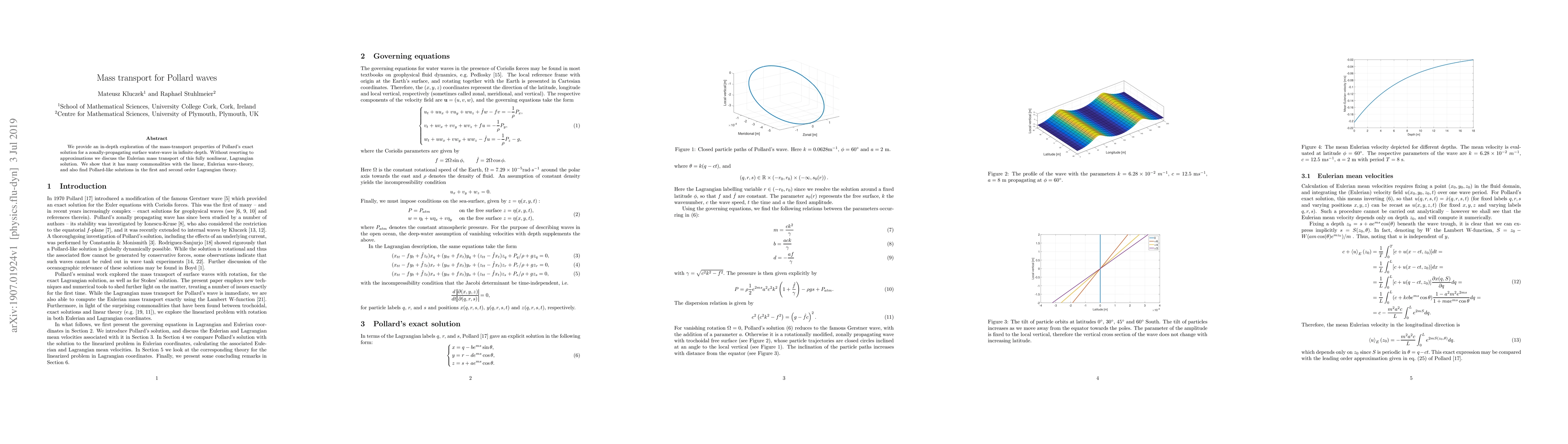 We provide an in-depth exploration of the mass-transport properties of Pollard's exact solution for a zonally-propagating surface water-wave in infinite depth. Without resorting to approximations we discuss the Eulerian mass transport of this fully nonlinear, Lagrangian solution. We show that it has many commonalities with the linear, Eulerian wave-theory, and also find Pollard-like solutions in the first and second order Lagrangian theory.