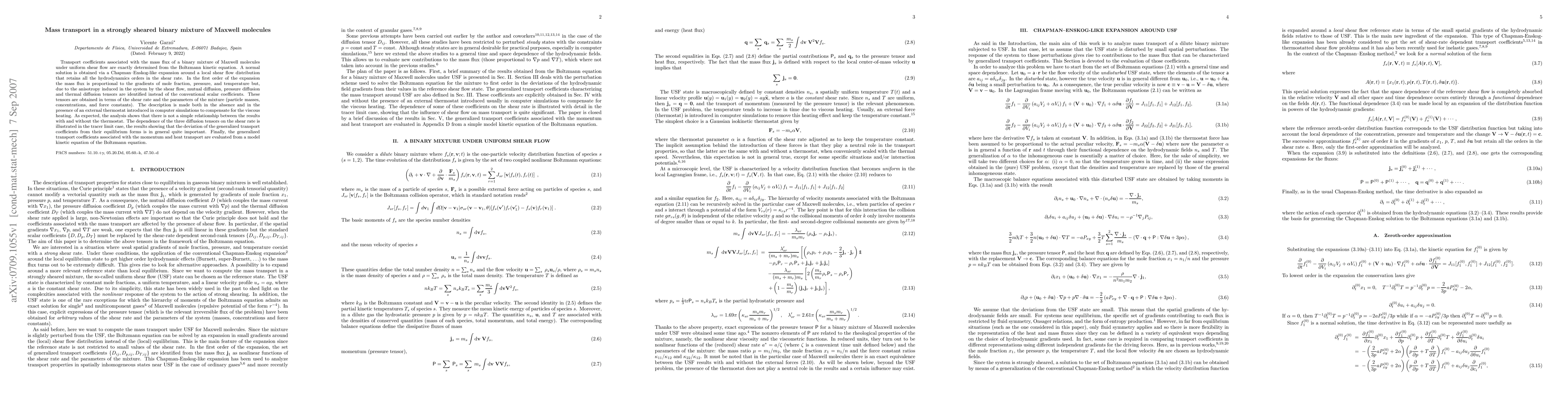 Transport coefficients associated with the mass flux of a binary mixture of Maxwell molecules under uniform shear flow are exactly determined from the Boltzmann kinetic equation. A normal solution is obtained via a Chapman--Enskog-like expansion around a local shear flow distribution that retains all the hydrodynamics orders in the shear rate. In the first order of the expansion the mass flux is proportional to the gradients of mole fraction, pressure, and temperature but, due to the anisotropy induced in the system by the shear flow, mutual diffusion, pressure diffusion and thermal diffusion tensors are identified instead of the conventional scalar coefficients. These tensors are obtained in terms of the shear rate and the parameters of the mixture (particle masses, concentrations, and force constants). The description is made both in the absence and in the presence of an external thermostat introduced in computer simulations to compensate for the viscous heating. As expected, the analysis shows that there is not a simple relationship between the results with and without the thermostat. The dependence of the three diffusion tensors on the shear rate is illustrated in the tracer limit case, the results showing that the deviation of the generalized transport coefficients from their equilibrium forms is in general quite important. Finally, the generalized transport coefficients associated with the momentum and heat transport are evaluated from a model kinetic equation of the Boltzmann equation.