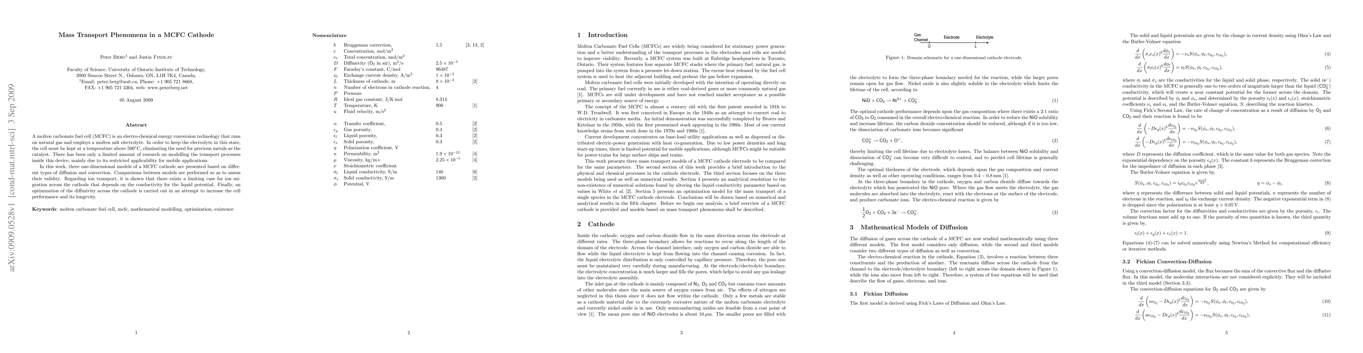 A molten carbonate fuel cell (MCFC) is an electro-chemical energy conversion technology that runs on natural gas and employs a molten salt electrolyte. In order to keep the electrolyte in this state, the cell must be kept at a temperature above 500 C, eliminating the need for precious metals as the catalyst. There has been only a limited amount of research on modelling the transport processes inside this device, mainly due to its restricted applicability for mobile applications. In this work, three one-dimensional models of a MCFC cathode are presented based on different types of diffusion and convection. Comparisons between models are performed so as to assess their validity. Regarding ion transport, it is shown that there exists a limiting case for ion migration across the cathode that depends on the conductivity for the liquid potential. Finally, an optimization of the diffusivity across the cathode is carried out in an attempt to increase the cell performance and its longevity.