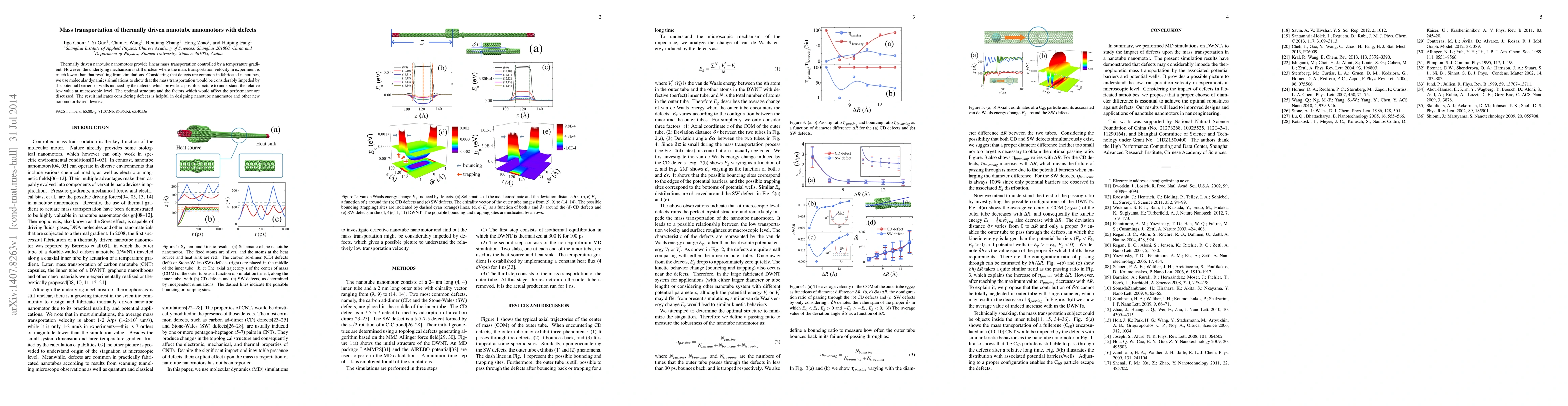 Thermally driven nanotube nanomotors provide linear mass transportation controlled by a temperature gradient. However, the underlying mechanism is still unclear where the mass transportation velocity in experiment is much lower than that resulting from simulations. Considering that defects are common in fabricated nanotubes, we use molecular dynamics simulations to show that the mass transportation would be considerably impeded by the potential barriers or wells induced by the defects, which provides a possible picture to understand the relative low value at microscopic level. The optimal structure and the factors which would affect the performance are discussed. The result indicates considering defects is helpful in designing nanotube nanomotor and other new nanomotor-based devices.