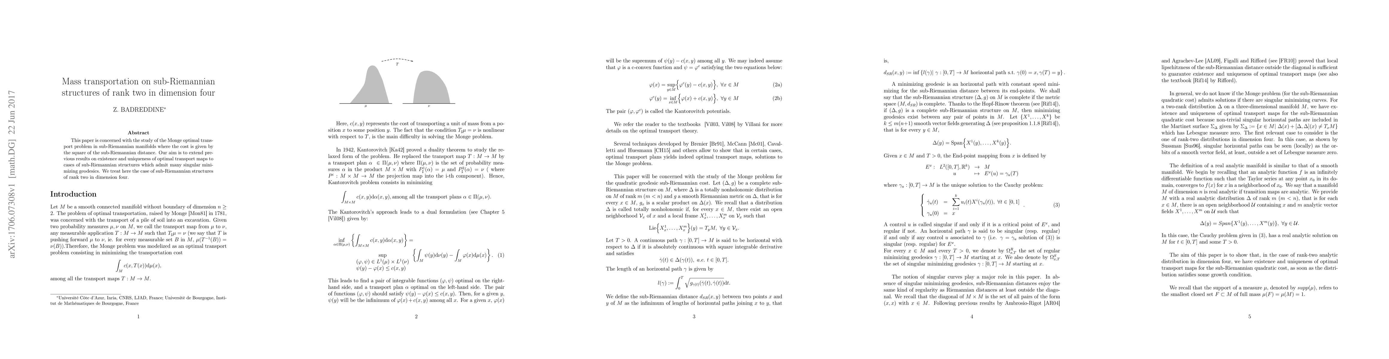 This paper investigates the Monge optimal transport problem in sub-Riemannian manifolds of rank two in dimension four, focusing on the existence and uniqueness of optimal transport maps amidst singular minimizing geodesics. The study extends previous results to more complex sub-Riemannian structures.