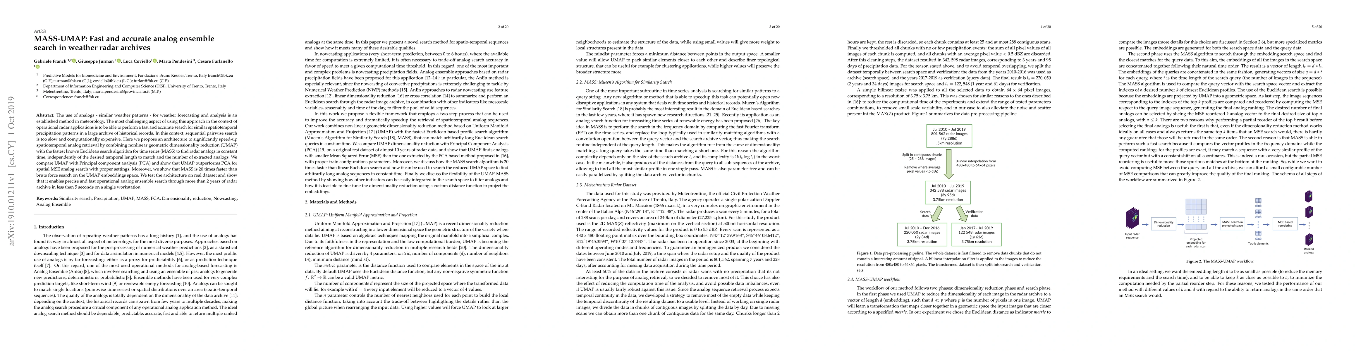 This paper proposes MASS-UMAP, a method combining UMAP and MASS algorithms to rapidly and accurately search for similar spatiotemporal precipitation patterns in large weather radar archives. It demonstrates that this approach is significantly faster than brute force methods and outperforms PCA in spatial MSE analog search.