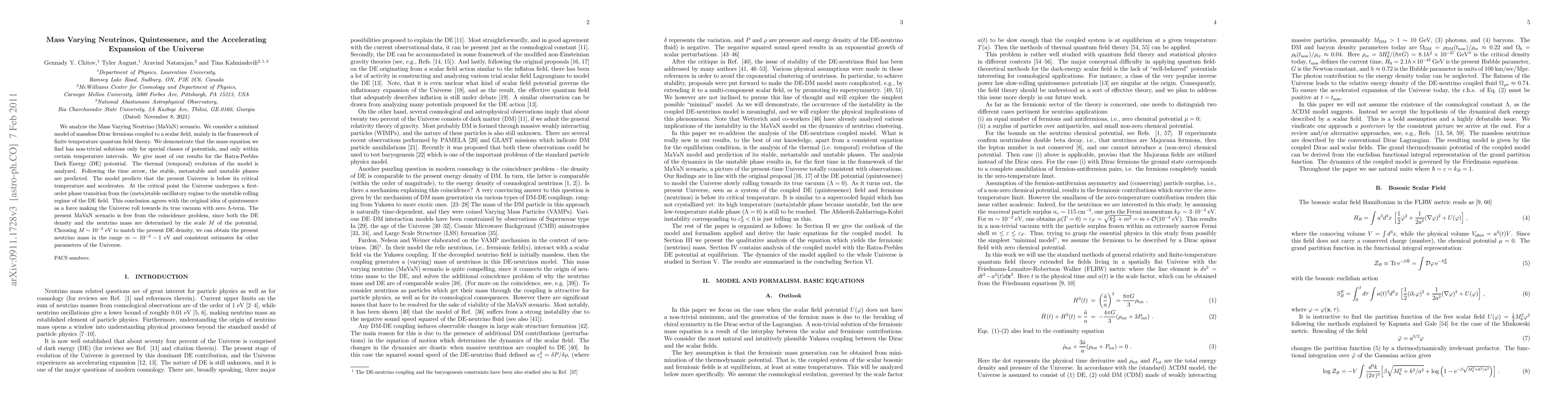 This paper explores the Mass Varying Neutrino (MaVaN) scenario, demonstrating that a scalar field coupled to massless Dirac fermions can explain the accelerating expansion of the Universe. The model predicts a first-order phase transition at a critical temperature, resolving the coincidence problem by linking dark energy density and neutrino mass to a single scale.