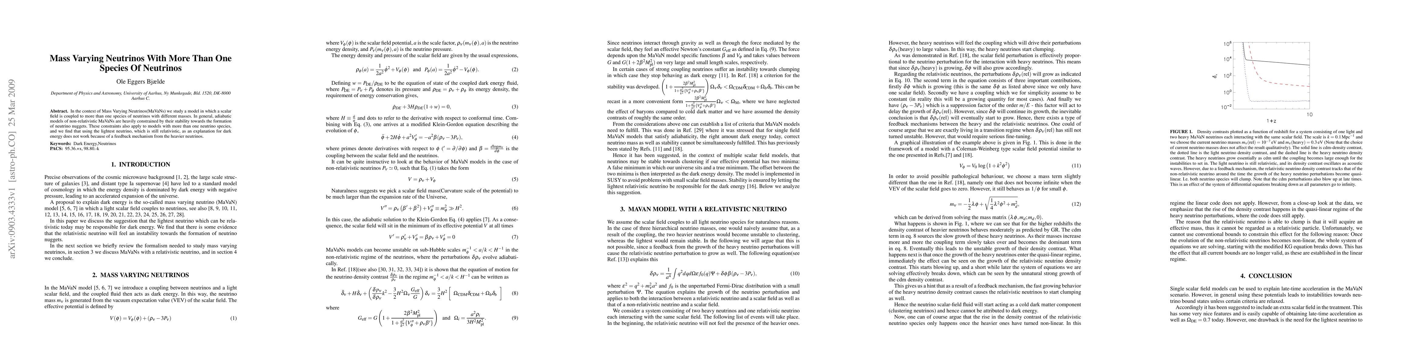 This paper explores a model where a scalar field interacts with multiple neutrino species of varying masses within the Mass Varying Neutrinos (MaVaNs) framework. It finds that the lightest relativistic neutrino cannot explain dark energy due to a feedback mechanism from the heavier neutrinos, which also constrains the stability of such models.