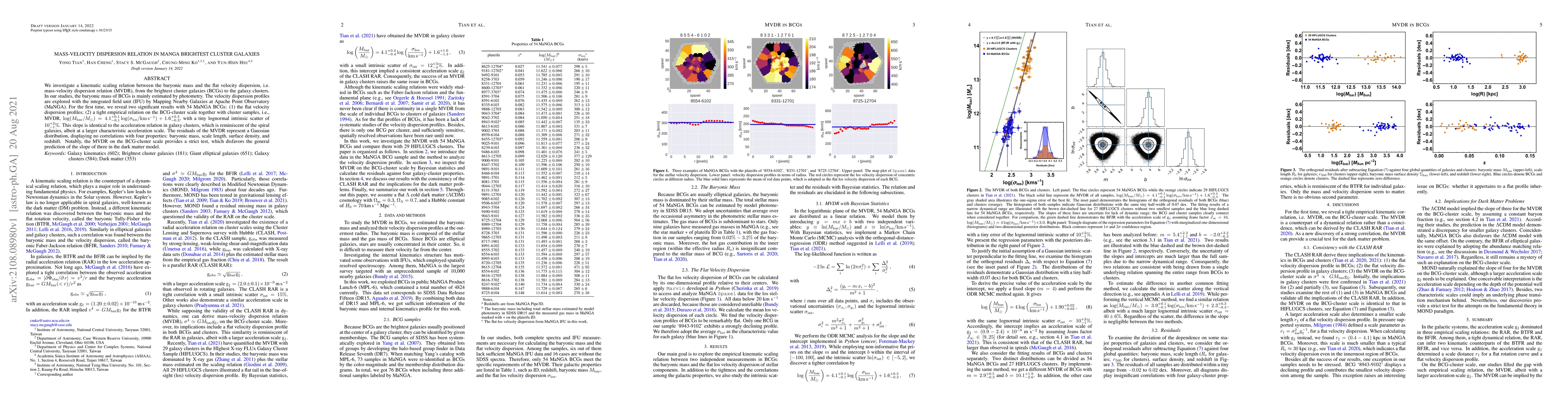 We investigate a kinematic scaling relation between the baryonic mass and the flat velocity dispersion, i.e. mass-velocity dispersion relation (MVDR), from the brightest cluster galaxies (BCGs) to the galaxy clusters. In our studies, the baryonic mass of BCGs is mainly estimated by photometry. The velocity dispersion profiles are explored with the integrated field unit (IFU) by Mapping Nearby Galaxies at Apache Point Observatory (MaNGA). For the first time, we reveal two significant results with 54 MaNGA BCGs: (1) the flat velocity dispersion profiles; (2) a tight empirical relation on the BCG-cluster scale together with cluster samples, i.e., MVDR, $\log(M_\mathrm{bar}/M_\odot)=4.1^{+0.1}_{-0.1}\log(\sigma_{\mathrm{los}}/\mathrm{km}\,\mathrm{s}^{-1})+1.6^{+0.3}_{-0.3}$, with a tiny lognormal intrinsic scatter of $10^{+2}_{-1}\%$. This slope is identical to the acceleration relation in galaxy clusters, which is reminiscent of the spiral galaxies, albeit at a larger characteristic acceleration scale. The residuals of the MVDR represent a Gaussian distribution, displaying no correlations with four properties: baryonic mass, scale length, surface density, and redshift. Notably, the MVDR on the BCG-cluster scale provides a strict test, which disfavors the general prediction of the slope of three in the dark matter model.