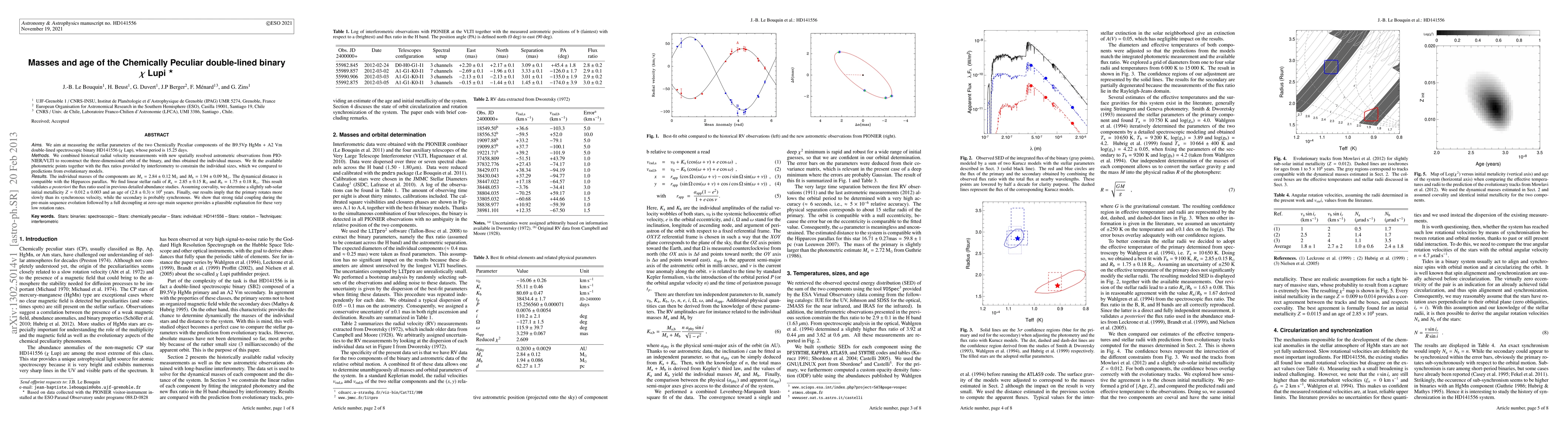 We aim at measuring the stellar parameters of the two Chemically Peculiar components of the B9.5Vp HgMn + A2 Vm double-lined spectroscopic binary HD141556, whose period is 15.25 days. We combined historical radial velocity measurements with new spatially resolved astrometric observations from PIONIER/VLTI to reconstruct the three-dimensional orbit of the binary, and thus obtained the individual masses. We fit the available photometric points together with the flux ratios provided by interferometry to constrain the individual sizes, which we compared to predictions from evolutionary models.The individual masses of the components are $\Ma = 2.84 \pm 0.12\ \Msun$ and $\Mb = 1.94 \pm 0.09\ \Msun$. The dynamical distance is compatible with the Hipparcos parallax. We find linear stellar radii of $\Ra=2.85 \pm 0.15\ \Rsun$ and $\Rb=1.75 \pm 0.18\ \Rsun$. This result validates a posteriori the flux ratio used in previous detailed abundance studies. We determine a sub-solar initial metallicity $Z=0.012\pm0.003$ and an age of $(2.8\pm0.3)\times10^8\ $years. Our results imply that the primary rotates more slowly than its synchronous velocity, while the secondary is probably synchronous. We show that strong tidal coupling during the pre-main sequence evolution followed by a full decoupling at zero-age main sequence provides a plausible explanation for these very low rotation rates.