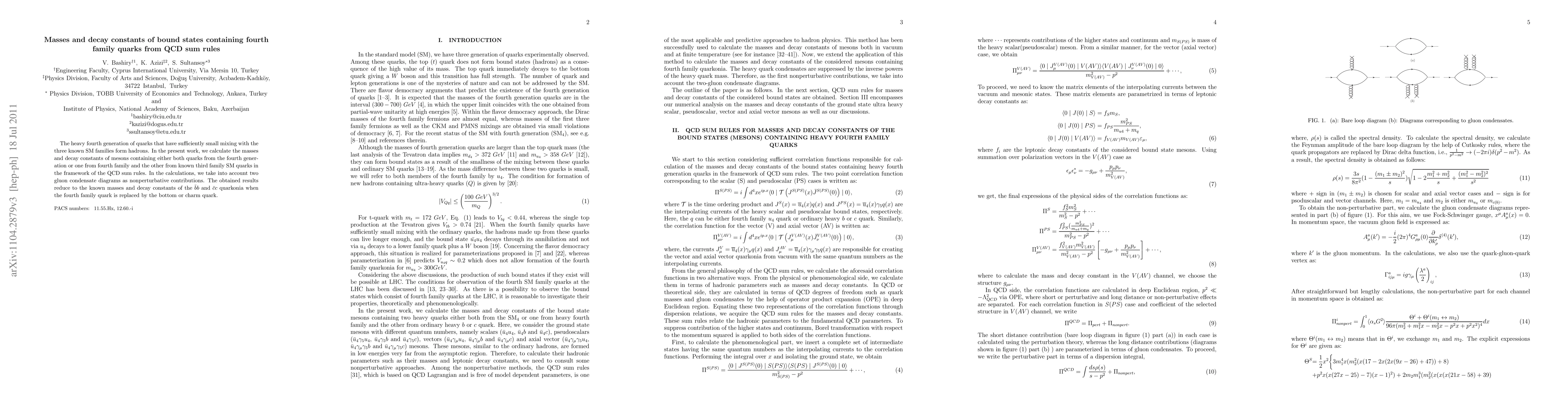 The heavy fourth generation of quarks that have sufficiently small mixing with the three known SM families form hadrons. In the present work, we calculate the masses and decay constants of mesons containing either both quarks from the fourth generation or one from fourth family and the other from known third family SM quarks in the framework of the QCD sum rules. In the calculations, we take into account two gluon condensate diagrams as nonperturbative contributions. The obtained results reduce to the known masses and decay constants of the $\bar b b$ and $\bar c c$ quarkonia when the fourth family quark is replaced by the bottom or charm quark.