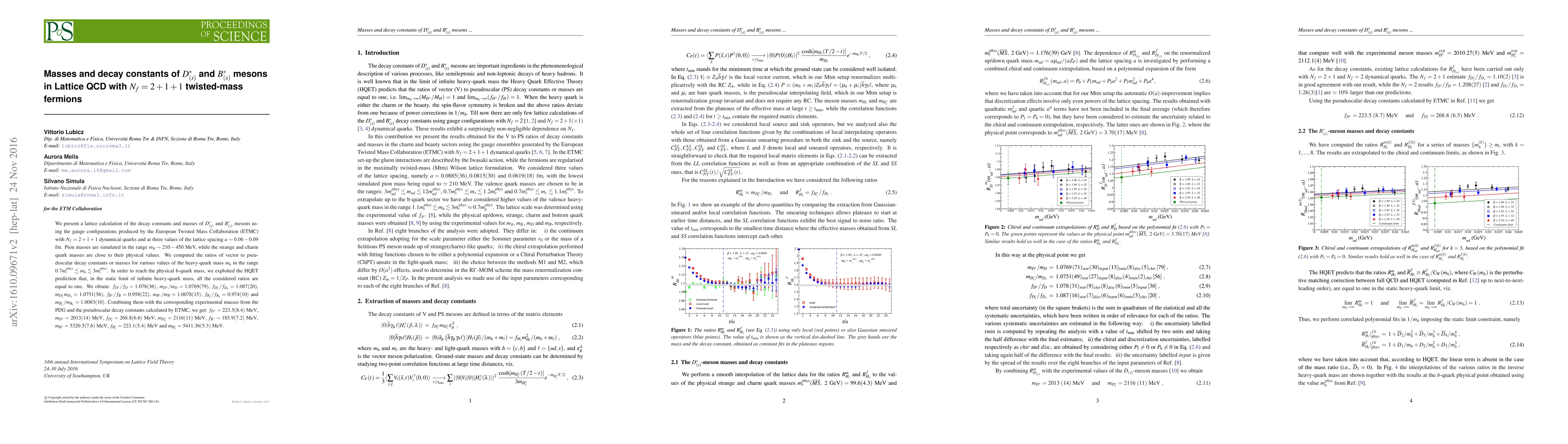 We present a lattice calculation of the decay constants and masses of $D_{(s)}^*$ and $B_{(s)}^*$ mesons using the gauge configurations produced by the European Twisted Mass Collaboration (ETMC) with $N_f = 2 + 1 + 1$ dynamical quarks and at three values of the lattice spacing $a \sim 0.06 - 0.09$ fm. Pion masses are simulated in the range $m_{\pi} \sim 210 - 450$ MeV, while the strange and charm quark masses are close to their physical values. We computed the ratios of vector to pseudoscalar decay constants or masses for various values of the heavy-quark mass $m_h$ in the range $0.7 m_c^{phys} \lesssim m_h \lesssim 3 m_c^{phys}$. In order to reach the physical b-quark mass, we exploited the HQET prediction that, in the static limit of infinite heavy-quark mass, all the considered ratios are equal to one. We obtain: $ f_{D^*}/f_{D} = 1.078(36),$ $m_{D^*}/m_{D} = 1.0769(79)$, $f_{D^*_{s}}/f_{D_{s}} = 1.087(20)$, $m_{D^*_{s}}m_{D_{s}} = 1.0751(56)$, $f_{B^*}/f_{B} = 0.958(22)$, $m_{B^*}/m_{B} = 1.0078(15)$, $f_{B^*_{s}}/f_{B_{s}} = 0.974(10)$ and $m_{B^*_{s}}/m_{B_{s}} = 1.0083(10)$. Combining them with the corresponding experimental masses from the PDG and the pseudoscalar decay constants calculated by ETMC, we get: $f_{D^*} = 223.5(8.4)~\mathrm{MeV}$, $m_{D^*} = 2013(14)~\mathrm{MeV}$, $f_{D^*_{s}} = 268.8(6.6)~\mathrm{MeV}$, $ m_{D^*_{s}} = 2116(11)~\mathrm{MeV}$, $f_{B^*} = 185.9(7.2)~\mathrm{MeV}$, $m_{B^*} = 5320.5(7.6)~\mathrm{MeV}$, $f_{B^*_{s}} = 223.1(5.4)~\mathrm{MeV}$ and $m_{B^*_{s}}= 5411.36(5.3)~\mathrm{MeV}$.