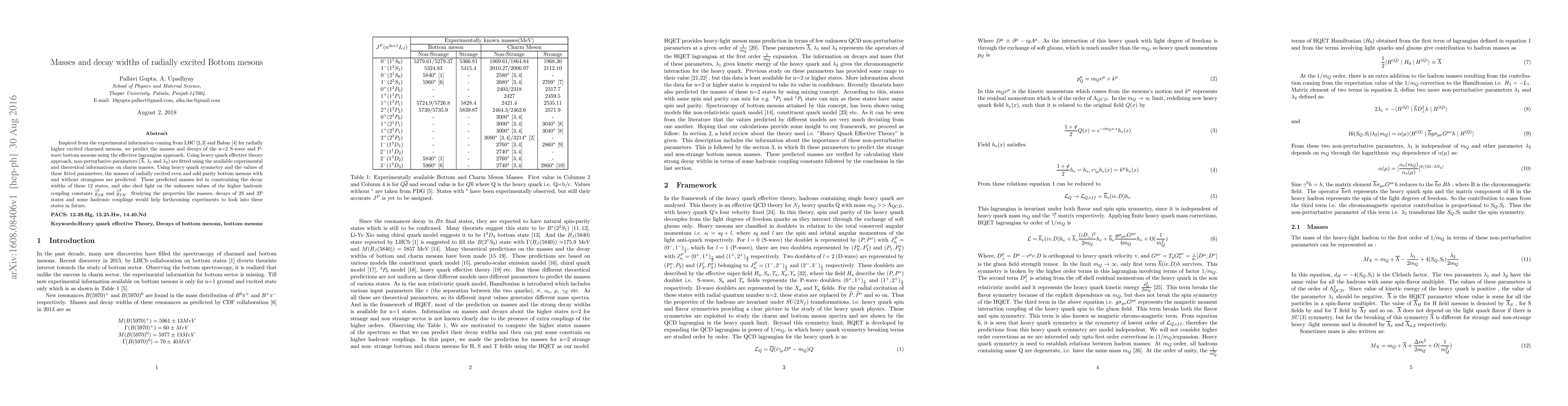 This paper predicts the masses and decay widths of radially excited bottom mesons (n=2 S-wave and P-wave) using the effective Lagrangian approach and heavy quark effective theory. Fitted parameters from charm mesons help constrain the decay widths and reveal unknown hadronic coupling constants.