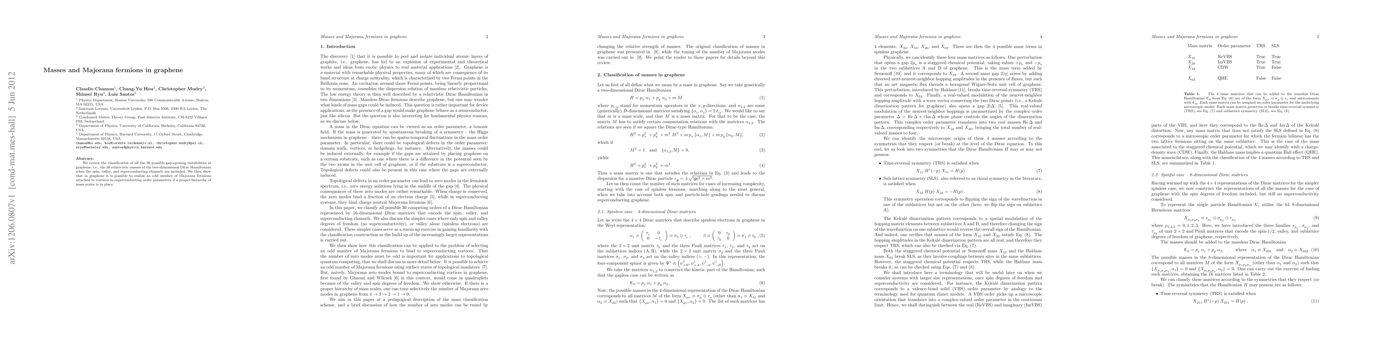 We review the classification of all the 36 possible gap-opening instabilities in graphene, i.e., the 36 relativistic masses of the two-dimensional Dirac Hamiltonian when the spin, valley, and superconducting channels are included. We then show that in graphene it is possible to realize an odd number of Majorana fermions attached to vortices in superconducting order parameters if a proper hierarchy of mass scales is in place.