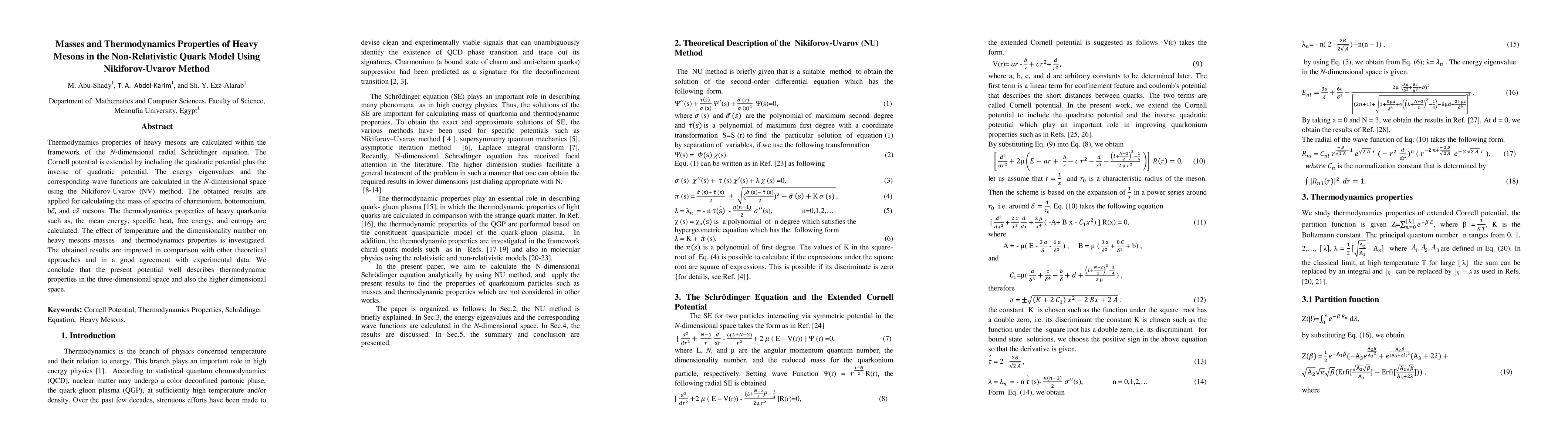 This paper calculates the masses and thermodynamic properties of heavy mesons using the non-relativistic quark model and the Nikiforov-Uvarov method. It extends the Cornell potential and applies it to charmonium, bottomonium, and other mesons, showing good agreement with experimental data and improved results over other theoretical approaches.