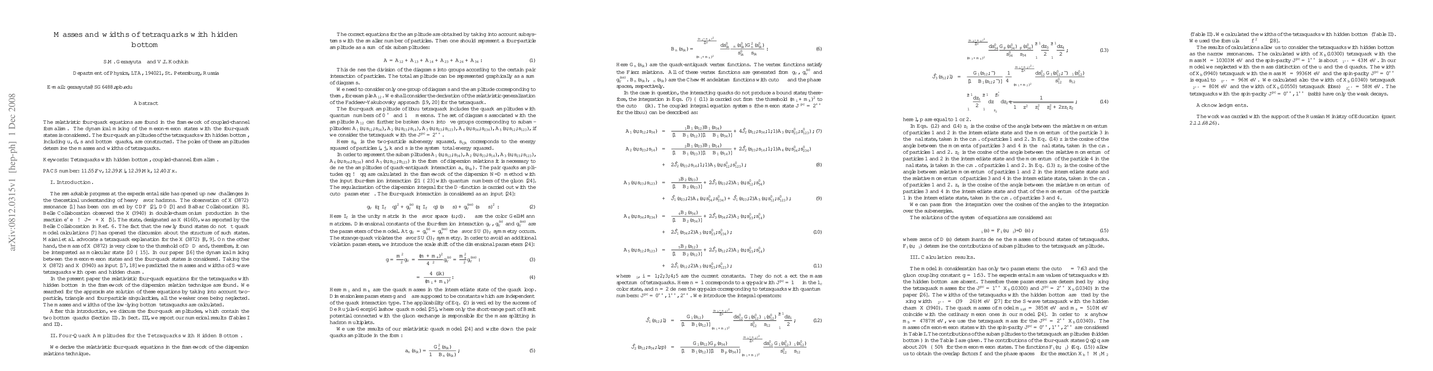 The relativistic four-quark equations are found in the framework of coupled-channel formalism. The dynamical mixing of the meson-meson states with the four-quark states is considered. The four-quark amplitudes of the tetraquarks with hidden bottom, including u, d, s and bottom quarks, are constructed. The poles of these amplitudes determine the masses and widths of tetraquarks.