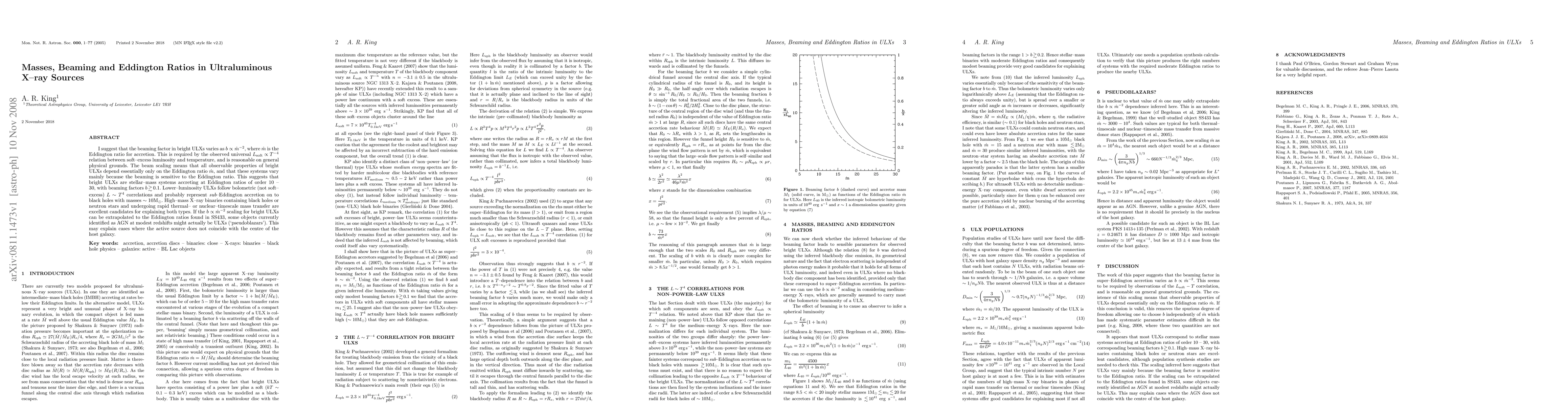 I suggest that the beaming factor in bright ULXs varies as $b \propto \dot m^{-2}$, where $\dot m$ is the Eddington ratio for accretion. This is required by the observed universal $L_{\rm soft} \propto T^{-4}$ relation between soft--excess luminosity and temperature, and is reasonable on general physical grounds. The beam scaling means that all observable properties of bright ULXs depend essentially only on the Eddington ratio $\dot m$, and that these systems vary mainly because the beaming is sensitive to the Eddington ratio. This suggests that bright ULXs are stellar--mass systems accreting at Eddington ratios of order 10 -- 30, with beaming factors $b \ga 0.1$. Lower--luminosity ULXs follow bolometric (not soft--excess) $L \sim T^4$ correlations and probably represent {\it sub}--Eddington accretion on to black holes with masses $\sim 10\msun$. High--mass X-ray binaries containing black holes or neutron stars and undergoing rapid thermal-- or nuclear--timescale mass transfer are excellent candidates for explaining both types. If the $b \propto \dot m^{-2}$ scaling for bright ULXs can be extrapolated to the Eddington ratios found in SS433, some objects currently identified as AGN at modest redshifts might actually be ULXs (`pseudoblazars'). This may explain cases where the active source does not coincide with the centre of the host galaxy.