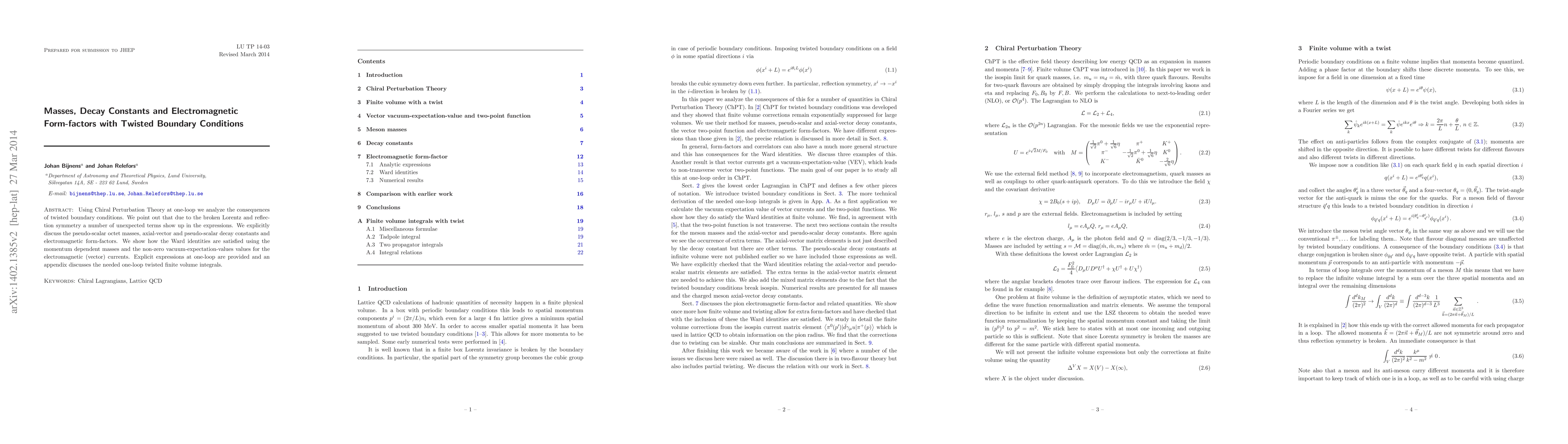 This paper uses Chiral Perturbation Theory at one-loop to analyze the effects of twisted boundary conditions, revealing unexpected terms due to broken Lorentz and reflection symmetry. It provides explicit expressions for pseudo-scalar octet masses, decay constants, and electromagnetic form-factors, demonstrating satisfaction of Ward identities through momentum-dependent masses and non-zero vacuum-expectation values for electromagnetic currents.
