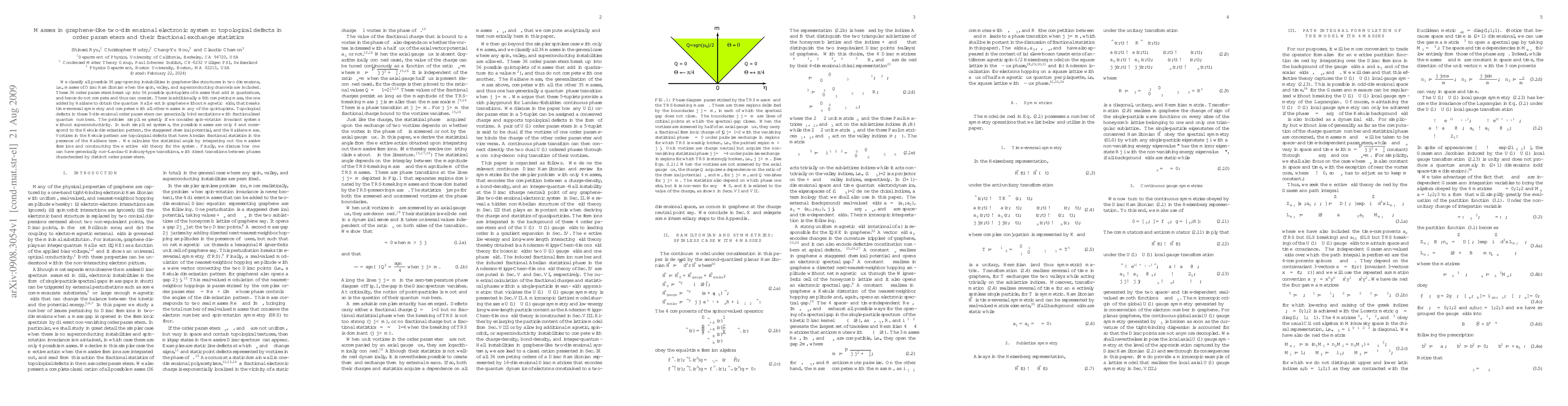 We classify all possible 36 gap-opening instabilities in graphene-like structures in two dimensions, i.e., masses of Dirac Hamiltonian when the spin, valley, and superconducting channels are included. These 36 order parameters break up into 56 possible quintuplets of masses that add in quadrature, and hence do not compete and thus can coexist. There is additionally a 6th competing mass, the one added by Haldane to obtain the quantum Hall effect in graphene without magnetic fields, that breaks time-reversal symmetry and competes with all other masses in any of the quintuplets. Topological defects in these 5-dimensional order parameters can generically bind excitations with fractionalized quantum numbers. The problem simplifies greatly if we consider spin-rotation invariant systems without superconductivity. In such simplified systems, the possible masses are only 4 and correspond to the Kekul\'e dimerization pattern, the staggered chemical potential, and the Haldane mass. Vortices in the Kekul\'e pattern are topological defects that have Abelian fractional statistics in the presence of the Haldane term. We calculate the statistical angle by integrating out the massive fermions and constructing the effective field theory for the system. Finally, we discuss how one can have generically non-Landau-Ginzburg-type transitions, with direct transitions between phases characterized by distinct order parameters.