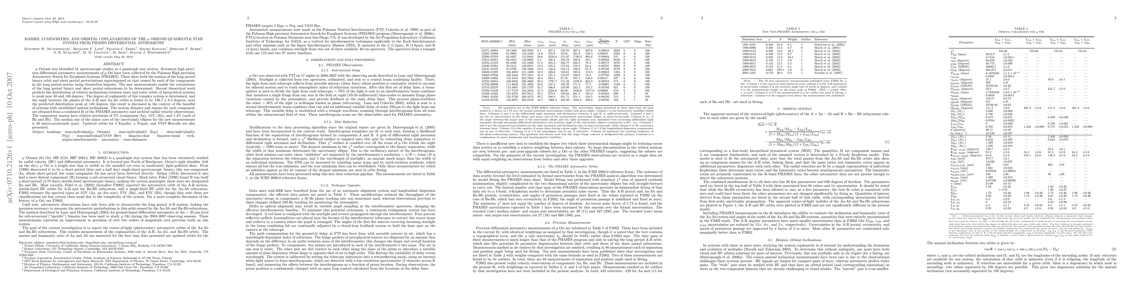 This paper uses PHASES differential astrometry to determine the masses, luminosities, and orbital coplanarities of the mu Orionis quadruple star system. The analysis reveals a 136.7 +/- 8.3 degrees angle between the orbital planes, near the predicted distribution peak, and provides precise component masses with relative precisions ranging from 1.4% to 15%.