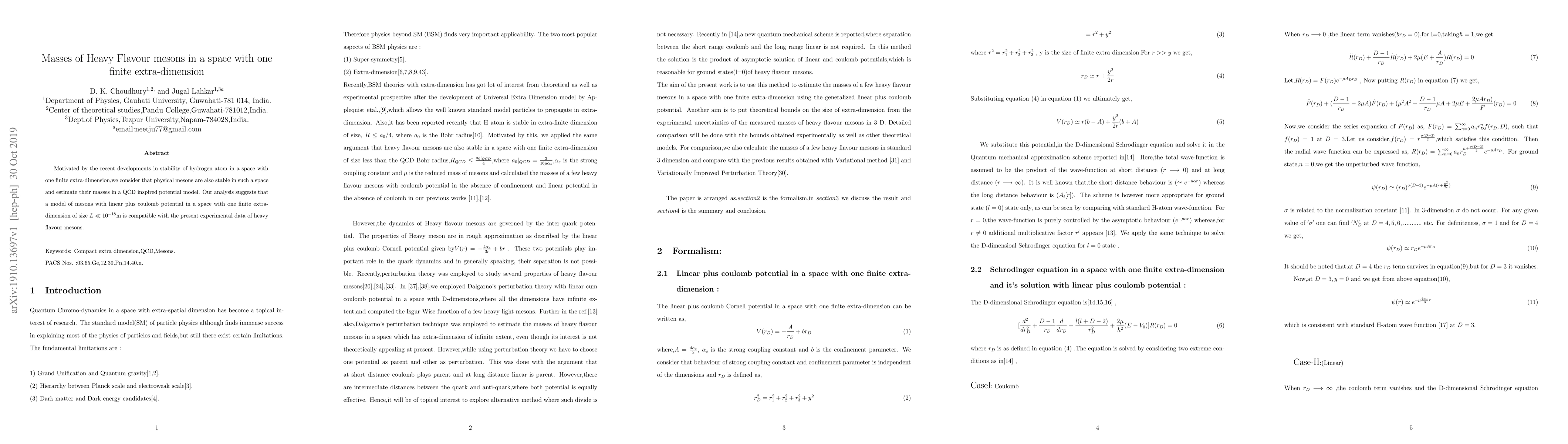 Motivated by the recent developments in stability of hydrogen atom in a space with one finite extra-dimension,we consider that physical mesons are also stable in such a space and estimate their masses in a QCD inspired potential model. Our analysis suggests that a model of mesons with linear plus coulomb potential in a space with one finite extra-dimension of size very very less than 10^{-18} m is compatible with the present experimental data of heavy flavour mesons.