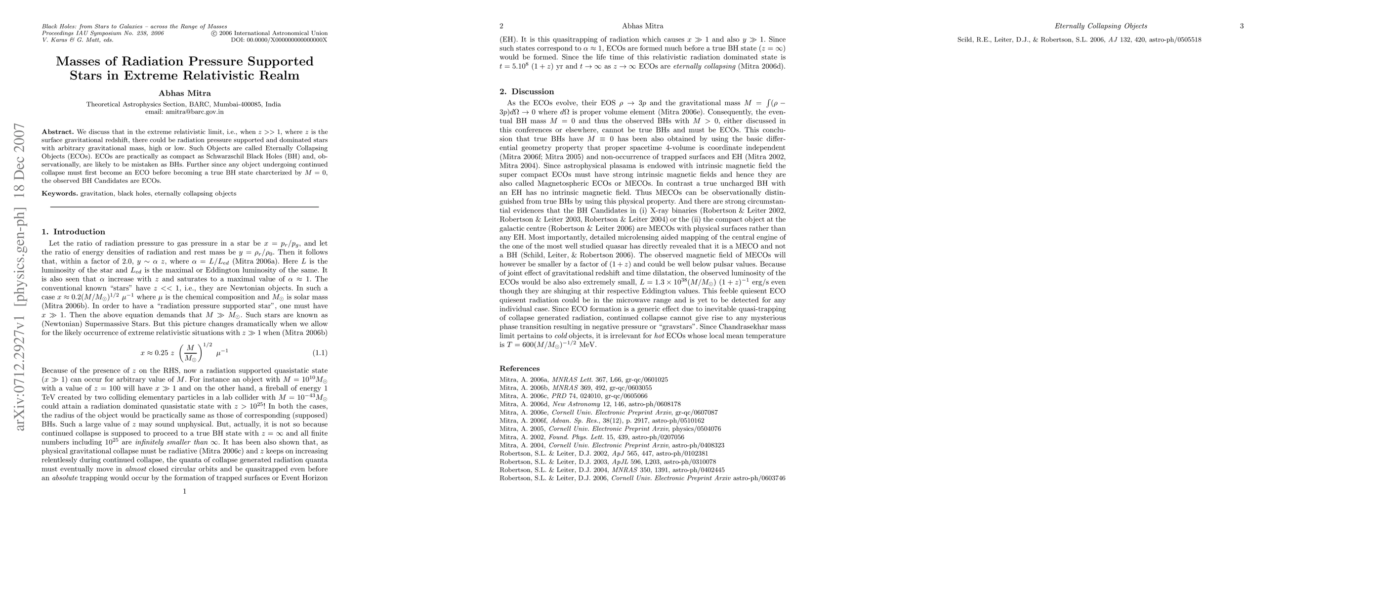 We discuss that in the extreme relativistic limit, i.e., when z >>1, where z is the surface gravitational redshift, there could be radiation pressure supported and dominated stars with arbitrary gravitational mass, high or low. Such Objects are called Eternally Collapsing Objects (ECOs). ECOs are practically as compact as Schwarzschil Black Holes (BH) and, observationally, are likely to be mistaken as BHs. Further since any object undergoing continued collapse must first become an ECO before becoming a true BH state charcterized by M=0, the observed BH Candidates are ECOs.