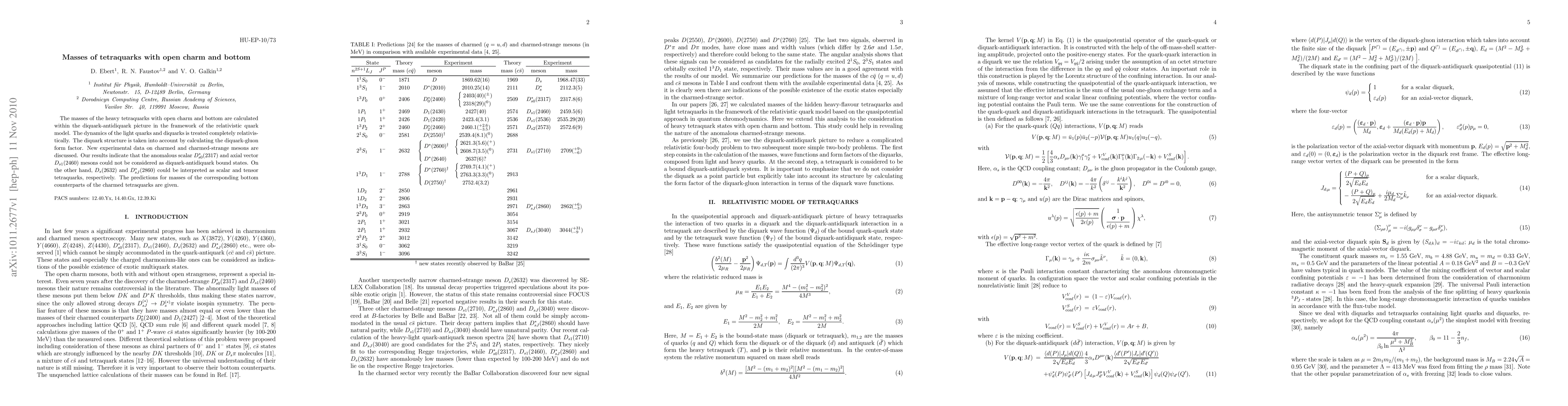 The masses of the heavy tetraquarks with open charm and bottom are calculated within the diquark-antidiquark picture in the framework of the relativistic quark model. The dynamics of the light quarks and diquarks is treated completely relativistically. The diquark structure is taken into account by calculating the diquark-gluon form factor. New experimental data on charmed and charmed-strange mesons are discussed. Our results indicate that the anomalous scalar D_{s0}^*(2317) and axial vector D_{s1}(2460) mesons could not be considered as diquark-antidiquark bound states. On the other hand, D_s(2632) and D_{sJ}^*(2860) could be interpreted as scalar and tensor tetraquarks, respectively. The predictions for masses of the corresponding bottom counterparts of the charmed tetraquarks are given.