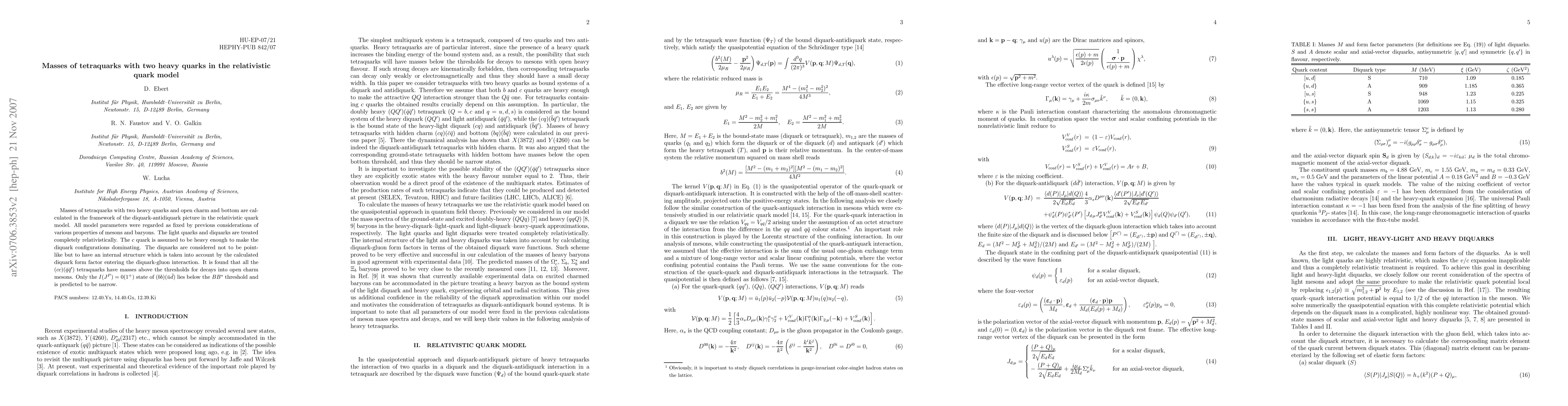 Researchers used a relativistic quark model to calculate masses of tetraquarks with two heavy quarks and found that most have masses above the threshold for decays into open charm mesons. The predicted narrow state has I(J^P)=0(1+), lying below the BB* threshold.