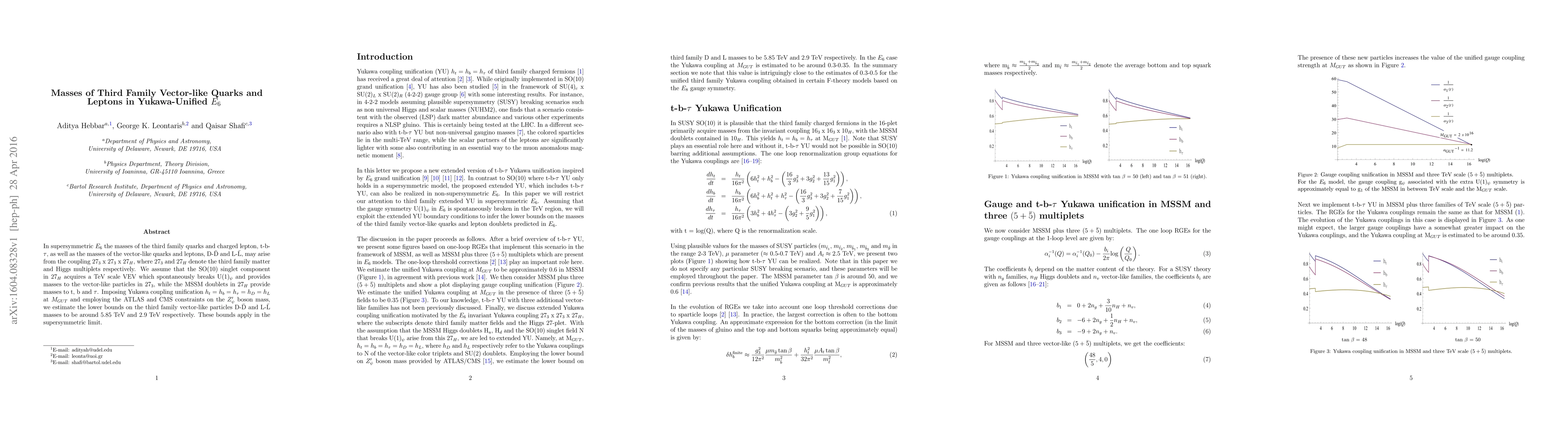 This research explores the mass generation mechanisms for third family vector-like quarks and leptons in the context of Yukawa-unified supersymmetric $E_6$ theory, estimating their masses to be around 5.85 TeV and 2.9 TeV respectively, based on Yukawa coupling unification and experimental constraints.