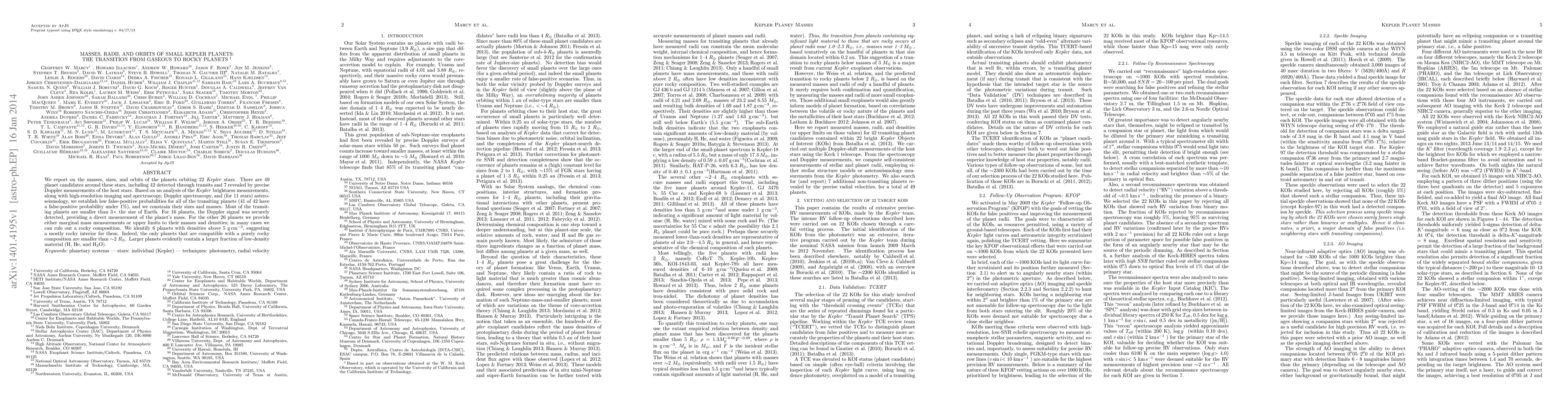 This research investigates the masses, radii, and orbits of 49 planet candidates around 22 Kepler stars, identifying 41 confirmed through transits and 7 via Doppler measurements. It reveals that most planets are smaller than three times Earth's size, with only smaller planets (~<2 R_earth) likely having a purely rocky composition, while larger ones contain significant low-density material.