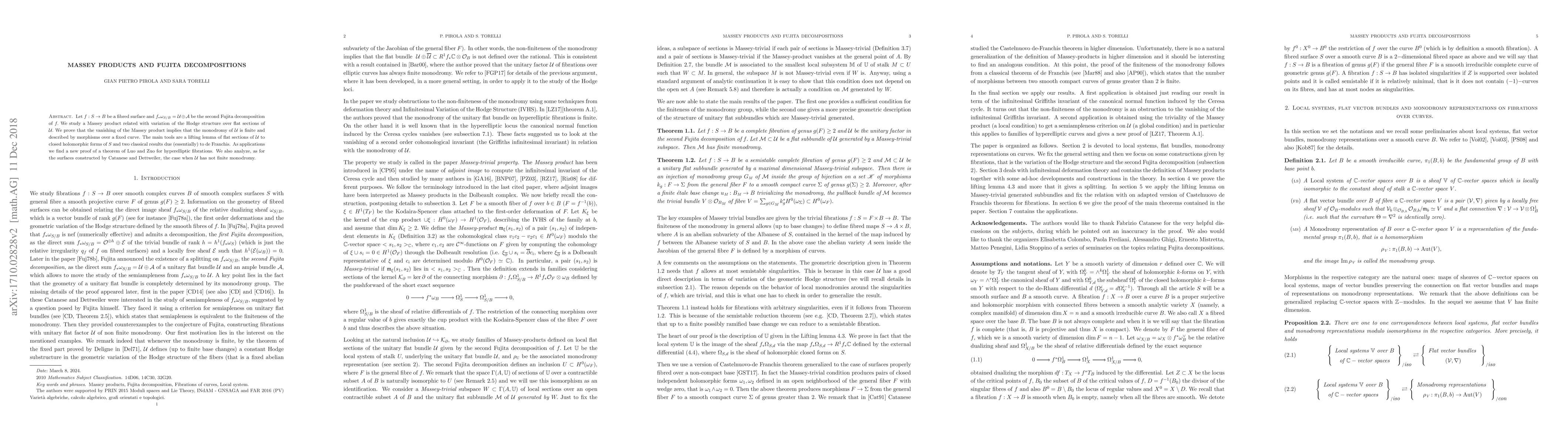 Let $f:S\to B$ be a fibration of curves and let $f_\ast\omega_{S/B}=\cU\oplus \cA$ be the second Fujita decomposition of $f.$ In this paper we study a kind of Massey products, which are defined as infinitesimal invariants by the cohomology of a curve, in relation to the monodromy of certain subbundles of $\cU$. The main result states that their vanishing on a general fibre of $f$ implies that the monodromy group acts faithfully on a finite set of morphisms and is therefore finite. In the last part we apply our result in terms of the normal function induced by the Ceresa cycle. On the one hand, we prove that the monodromy group of the whole $\cU$ of hyperelliptic fibrations is finite (giving another proof of a result due to Luo and Zuo). On the other hand, we show that the normal function is non torsion if the monodromy is infinite (this happens e.g. in the examples shown by Catanese and Dettweiler).