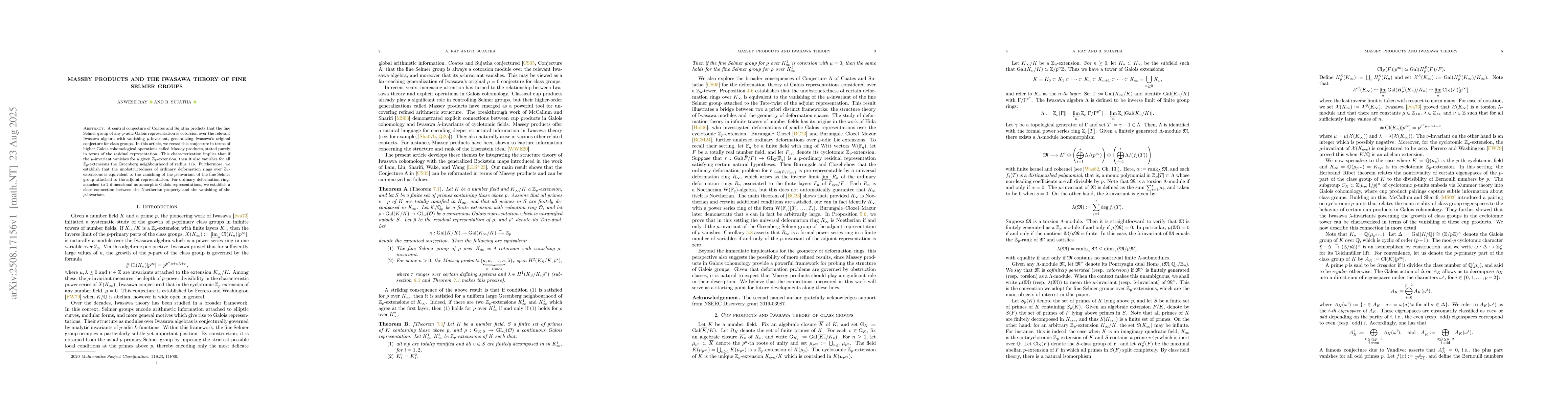 A central conjecture of Coates and Sujatha predicts that the fine Selmer group of any $p$-adic Galois representation is cotorsion over the relevant Iwasawa algebra with vanishing $\mu$-invariant, generalizing Iwasawa's original conjecture for class groups. In this article, we recast this conjecture in terms of higher Galois cohomological operations called Massey products, stated purely in terms of the residual representation. This characterization implies that if the $\mu$-invariant vanishes for a given $\mathbb{Z}_p$-extension, then it also vanishes for all $\mathbb{Z}_p$-extensions the Greenberg neighbourhood of radius $1/p$. Furthermore, we establish that the unobstructedness of ordinary deformation rings over $\mathbb{Z}_p$-extensions is equivalent to the vanishing of the $\mu$-invariant of the fine Selmer group attached to the adjoint representation. For ordinary deformation rings attached to $2$-dimensional automorphic Galois representations, we establish a close connection between the Noetherian property and the vanishing of the $\mu$-invariant.