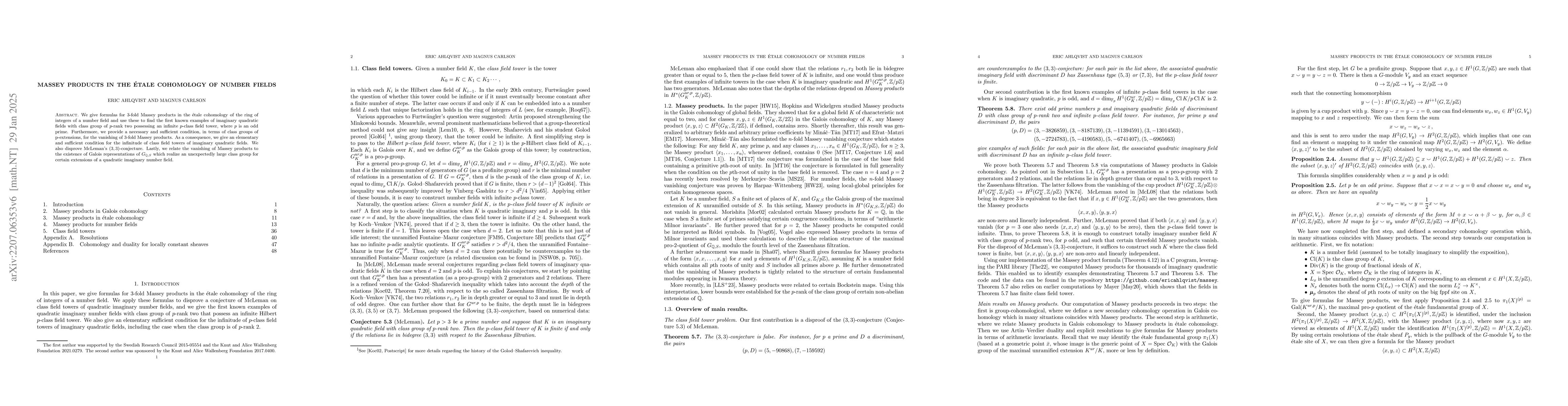 This paper presents formulas for 3-fold Massey products in the \'etale cohomology of number fields, using them to identify imaginary quadratic fields with class groups of $p$-rank two that have infinite $p$-class field towers for odd primes $p$. It also disproves McLeman's $(3,3)$-conjecture and relates the vanishing of Massey products to specific Galois representations.