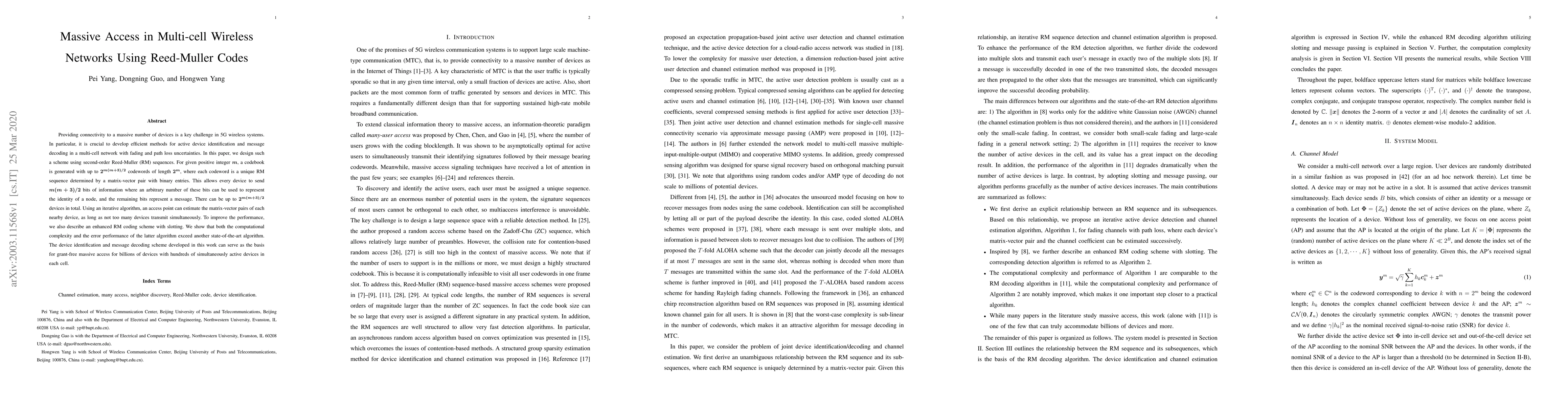 This paper proposes a scheme using second-order Reed-Muller codes for efficient device identification and message decoding in multi-cell wireless networks, enabling up to billions of devices to connect. The scheme allows devices to send unique RM sequences, facilitating simultaneous access and reducing computational complexity compared to state-of-the-art methods.