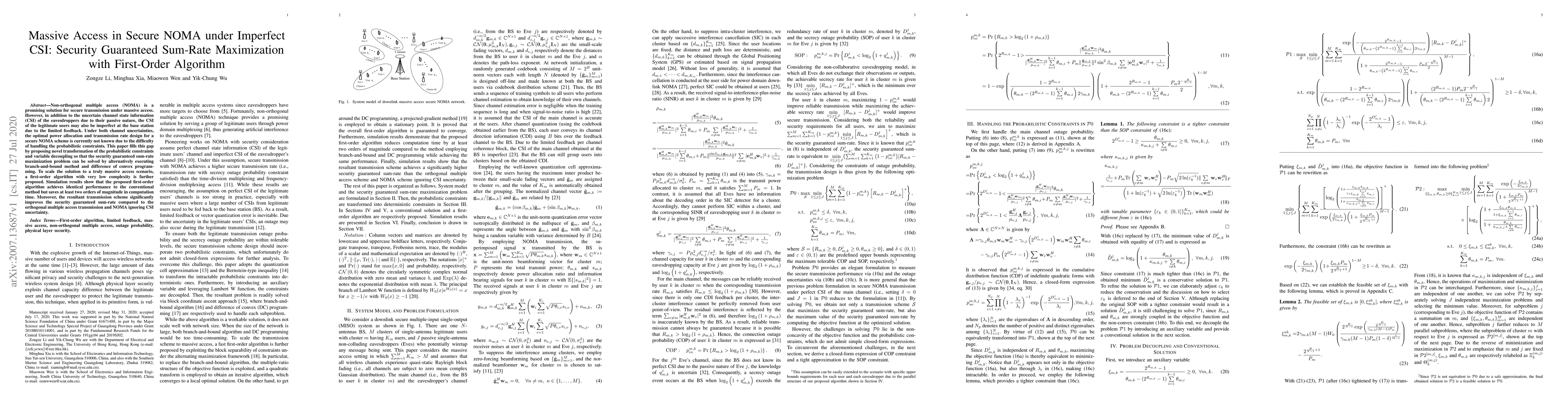 This paper proposes a novel method for secure sum-rate maximization in massive access NOMA under imperfect channel state information, using a first-order algorithm to handle probabilistic constraints efficiently. The approach significantly improves security guaranteed sum-rate compared to traditional methods.